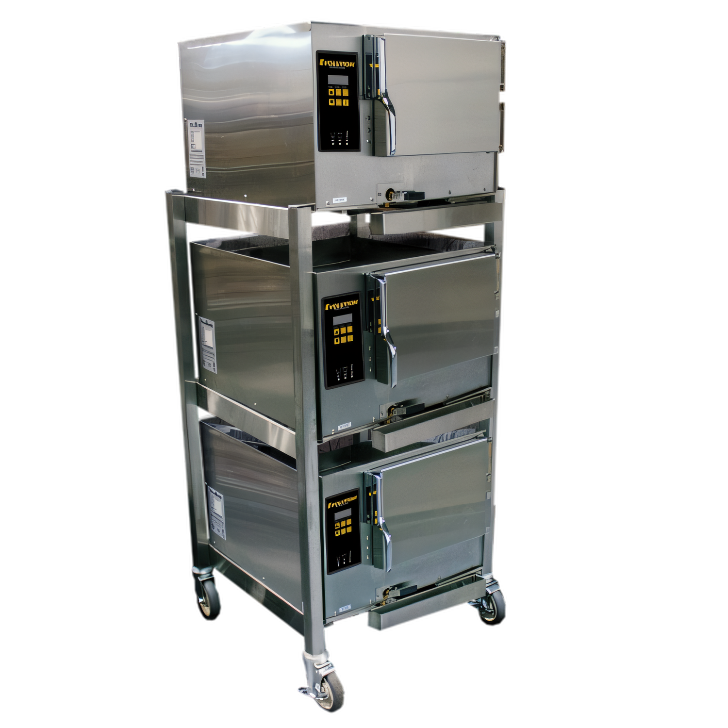 Three Connected Evolution™ Boilerless, Convection Steamers featuring Steam Vector Technology, electric, holds (3) 12" x 20" x 2-1/2" deep pans each compartment, Digital Controls, water & drain connections needs plumbed, warranty NOT voided by water quality, NO water filtration required, 6 kw, (3) 240v/60/1-ph, 25 amps, (3) 5' cords & NEMA L6-50P, cULus, Made in USA, UL EPH Classified, ENERGY STAR® (Includes stand in configuration of choice)