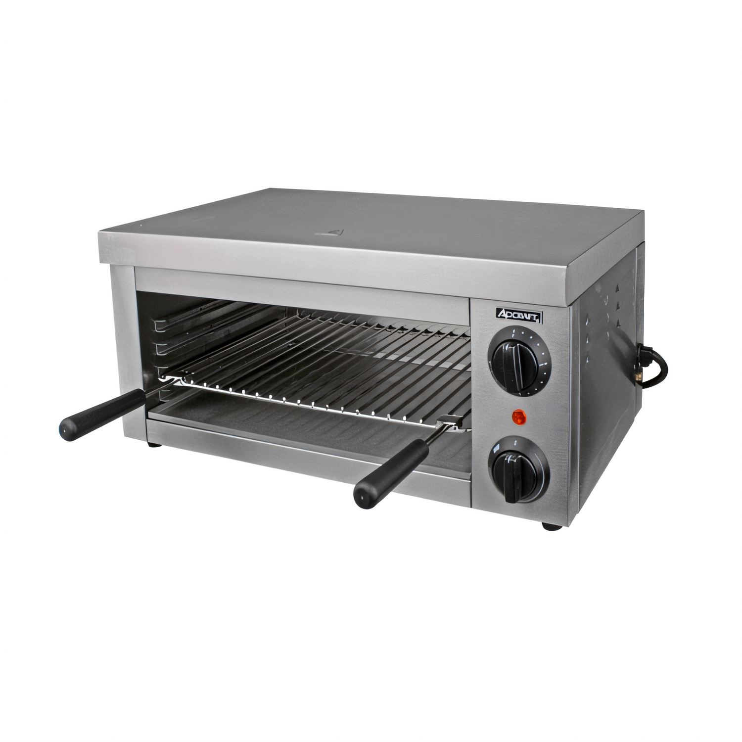 Cheesemelter, electric, countertop, 1.2kW, (4) rack positions, 24" long, infinite controls, metal sheath heating element, 15-minute timer, insulated body, removable food grid, 6" cool-to-touch bakelite handles, removable stainless steel crumb tray, non-slip rubber feet, stainless steel construction, 4 foot power cord, 120v, 10 amps, NEMA 5-15P, CE
