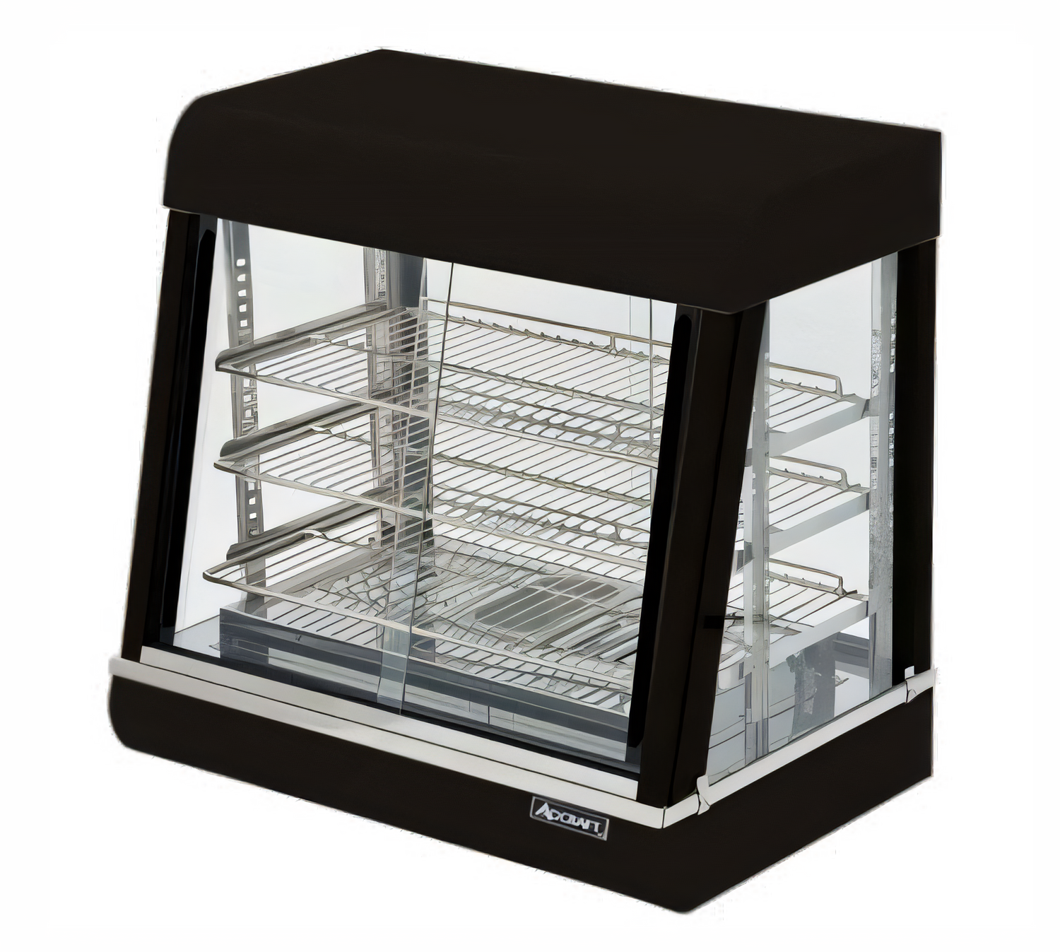 Countertop heated display with 3 adjustable shelves, interior light, sliding doors, thermostatic humidifier, stainless steel, ETL.