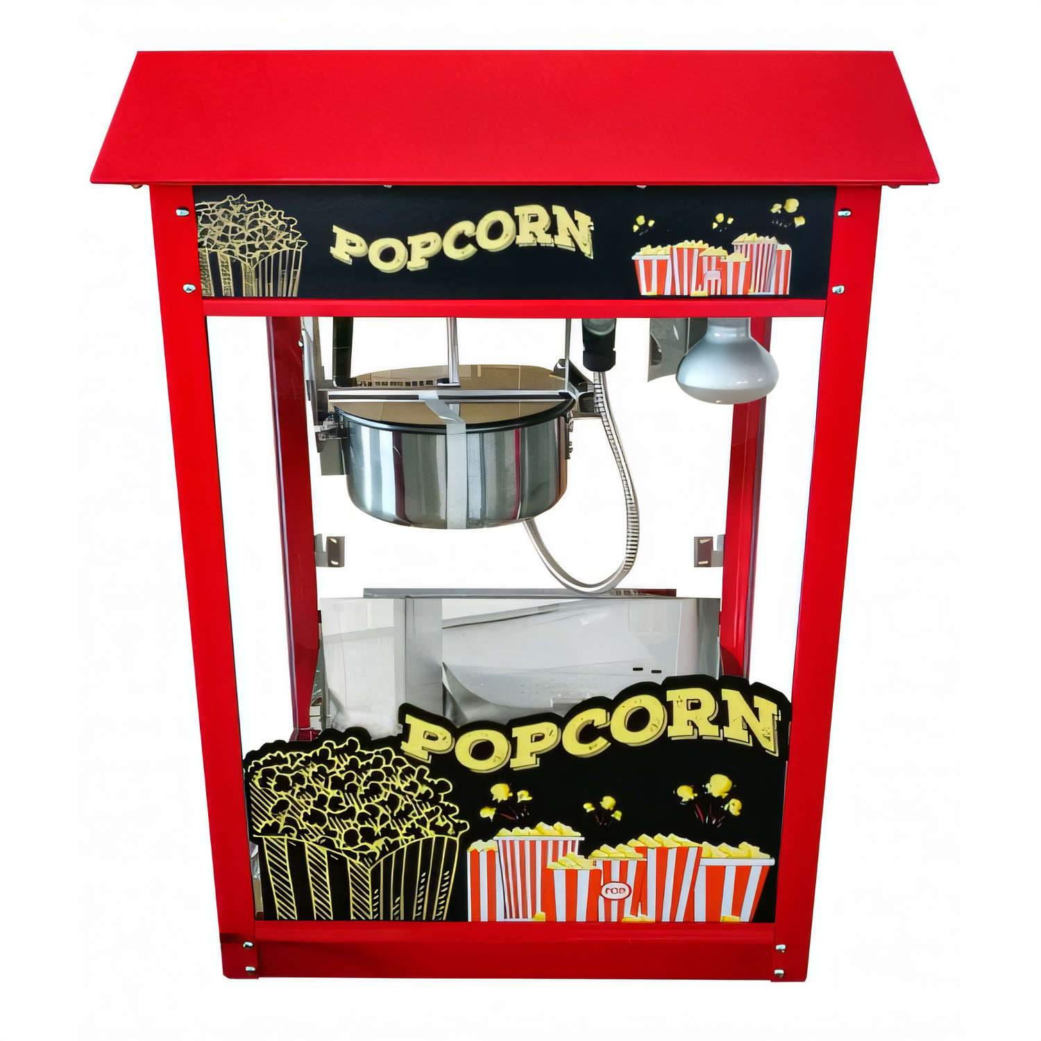 Admiral Craft PCM-8L 30" popcorn popper: 8 oz stainless kettle, removable trays, warmer light, durable red powder-coated top, 120V.