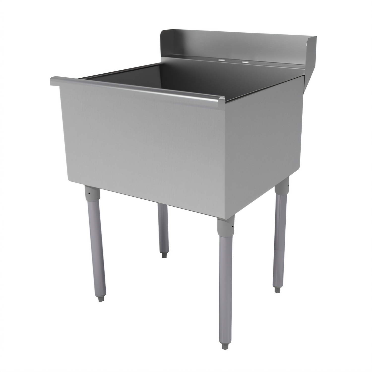 Square Corner Scullery Sink, 1-compartment, 24"W x 21"D front to-back x 14" deep sink compartment, rear deck with 8" OC faucet holes, 4"H backsplash, 1-1/2 IPS waste drain basket included, 16 gauge 430 stainless steel, galvanized legs with plastic bullet feet, 27" F/B x 24" L/R (overall)