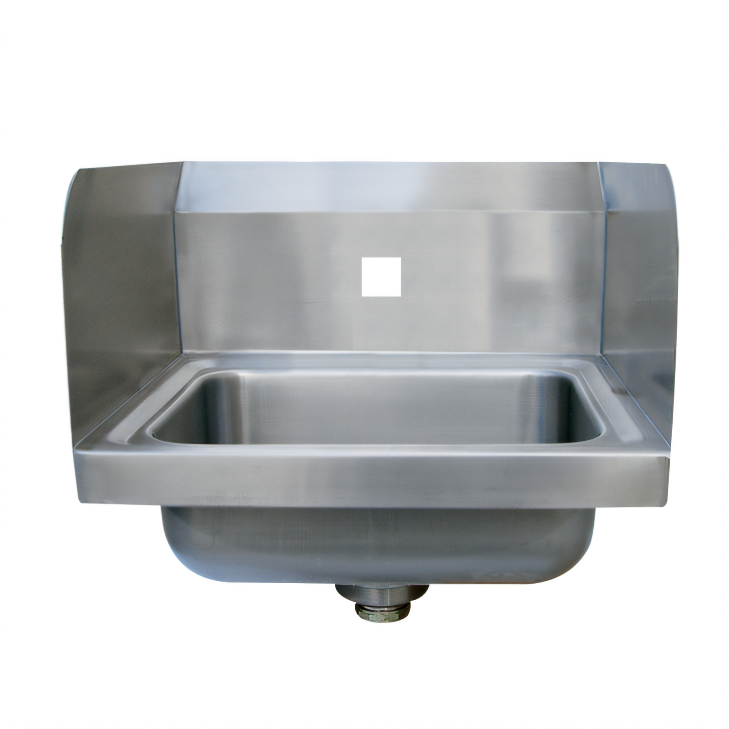 Special Value Hand Sink with 7-3/4" side splashes, wall model, 14" wide x 10" front-to-back x 5" deep bowl, 304 stainless steel construction, single splash faucet hole (no faucet), basket drain, wall bracket, NSF