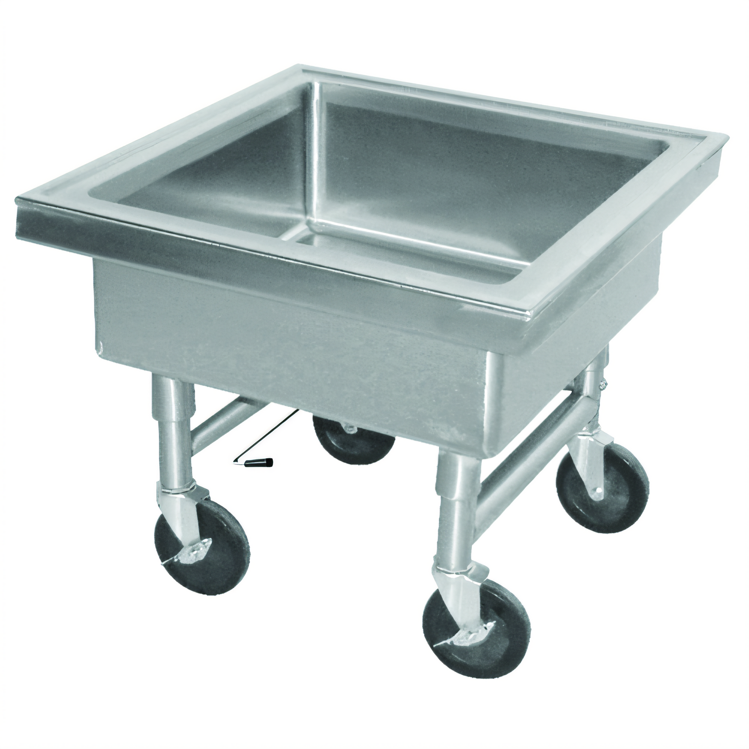 Special Value Soak Sink, portable, 20" working height, sink outlet fitted with quick-release drain, 22" x 22" x 8" deep fabricated sink compartment, stainless steel construction, casters, accommodates 19-3/4" x 19-3/4" dishwasher baskets (by others)