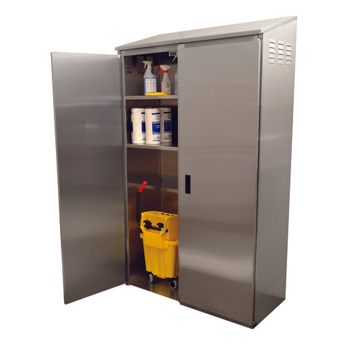 Cabinet with Mop Sink, 50-3/8"W x 23"D x 84"H O.A., double hinged doors, right side mop sink 20"W x 16"D front to back x 12" deep (wall mounted faucet & drain included), storage for mop bucket to roll in on left, (2) mop holders, (4) fixed intermediate shelves (3 on left, 1 on right above sink), slotted side panels for ventilation, 16/304 series stainless steel sink bowl, 18/304 series sink bowl apron, 18/430 series stainless steel cabinet, NSF