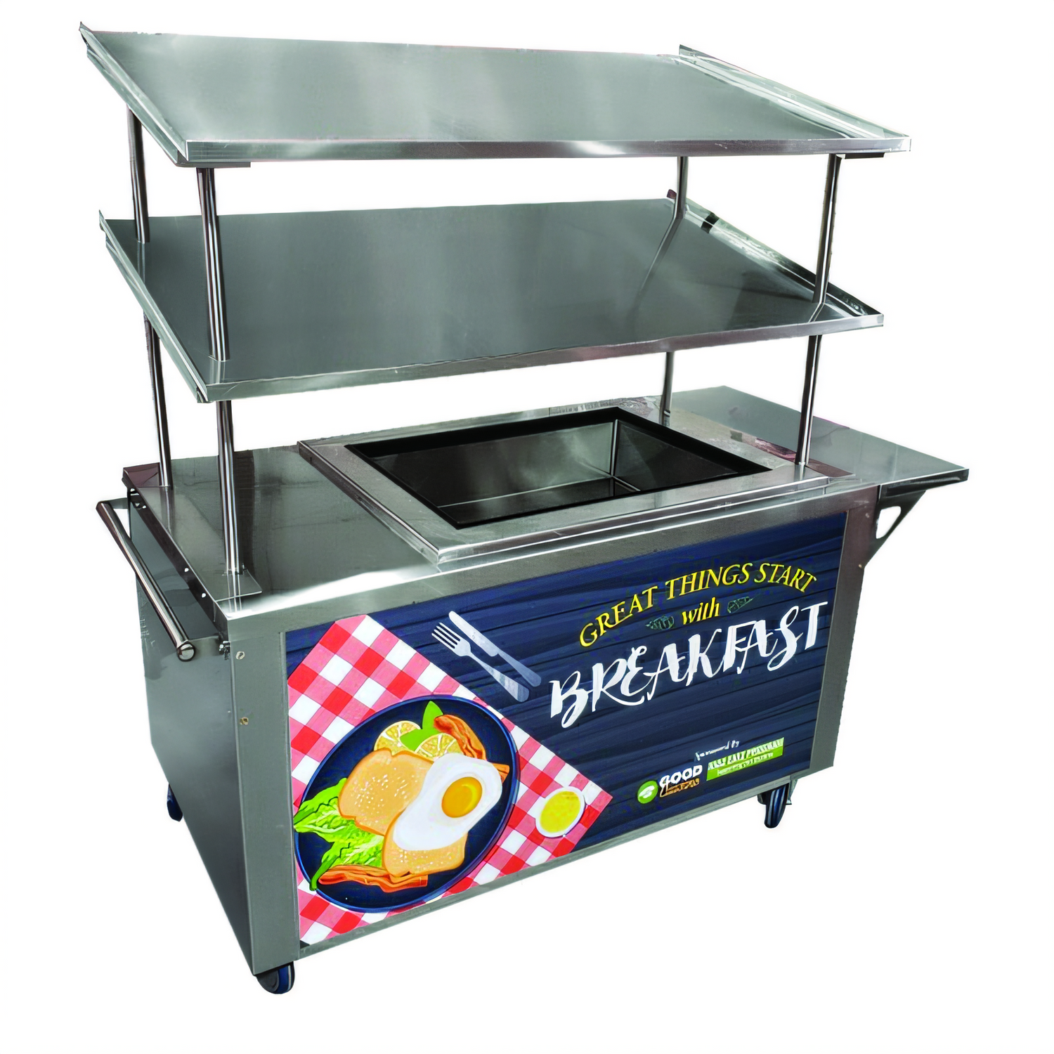 65-1/2"W x 30"D x 65-7/8"H • NSF Listed • Stainless SteelDesigned for high-volume cafeterias, grab-and-go stations, and on-the-move catering, the CPU-MC-52 combines a self-service display, an ice-cooled beverage/fruit well, and generous storage into one rock-solid, stainless-steel cart that rolls wherever you need it.