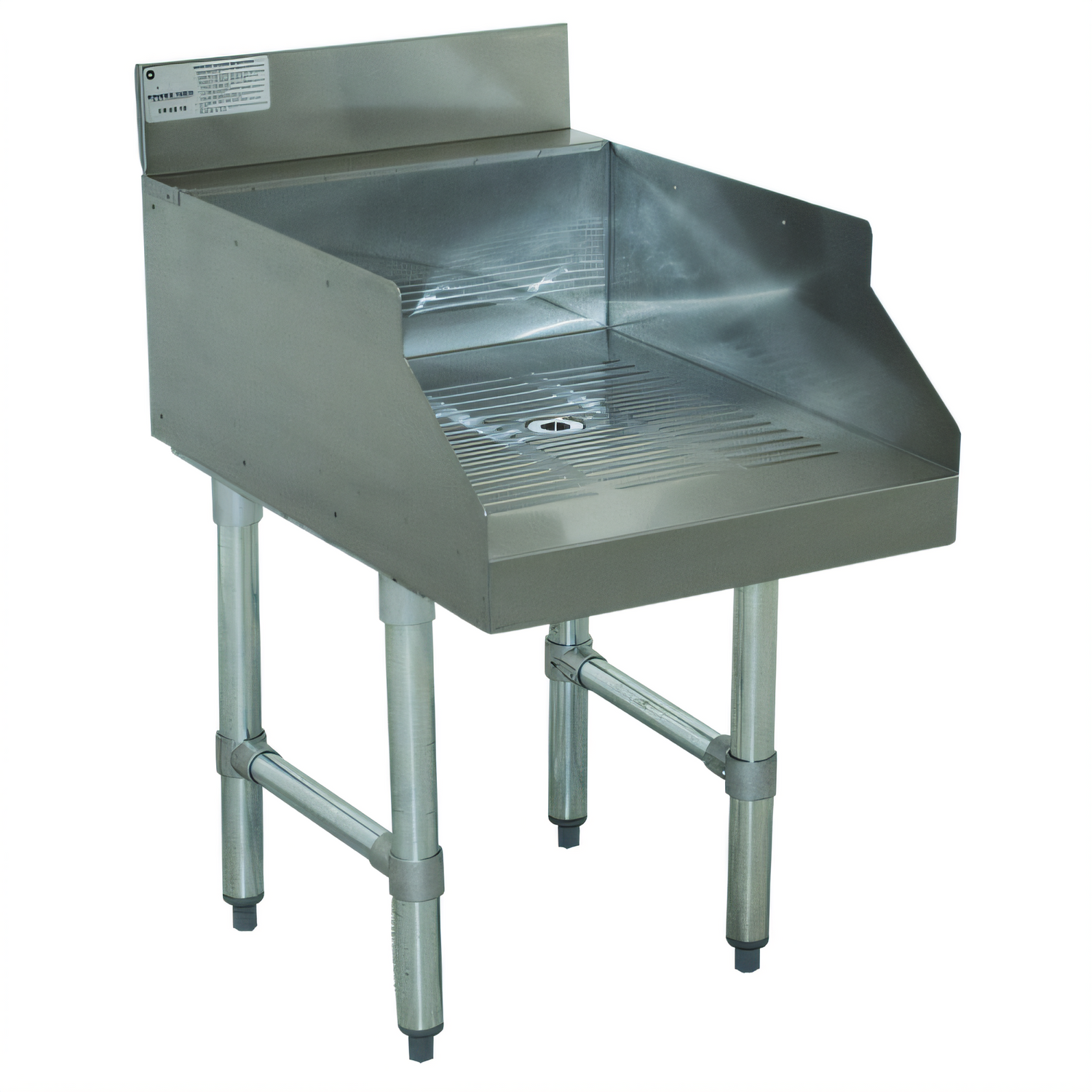 Underbar Basics™ Recessed Drainboard, underbar, for glass storage, 18"W x 26"D x 33"H, 23-1/2"H working surface with 1" IPS drain, 4"H rear splash, stainless steel construction, galvanized legs with adjustable plastic bullet feet, NSF