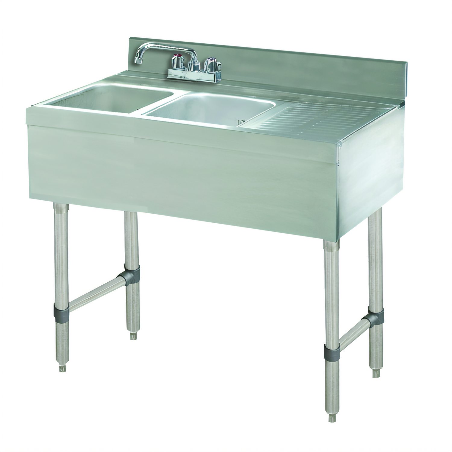Advance Tabco CRB Series | Right-hand drainboardDesigned for tight bar layouts that still demand full-size performance, the Advance Tabco Underbar Basics™ 2-Compartment Sink pairs deep-drawn seamless bowls with a space-saving 9" right drainboard and an NSF-listed, lead-free deck-mount faucet. Rugged stainless steel construction and a galvanneal understructure stand up to everyday use in pubs, tasting rooms, concession stands and more.
