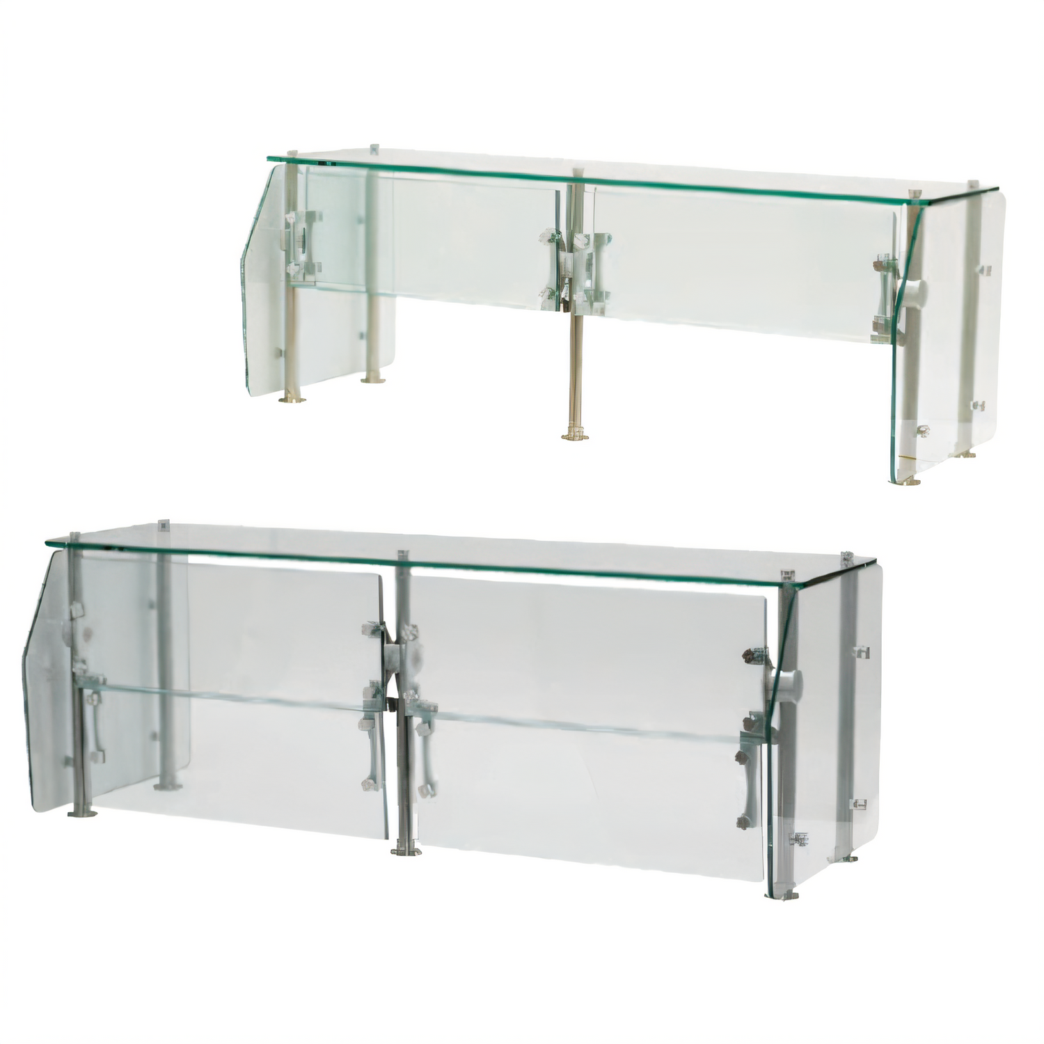 Sleek Shield™ Food Shield, multi-use (self-service or cafeteria style) (U.S. Patent No. 11,129,484), 120"W x 12"D x 18"H, with glass top shelf, 3/8" thick heat tempered glass front & 1/4" thick side panels (side panels 18" deep to meet NSF requirements), 3/8" thick heat tempered top glass, equipped with Chamber Lock™ technology fixed to upright legs, allowing rotation in 15 degree intervals, maximum load on top glass 100 pounds evenly distributed weight, includes: (2) additional center support posts (this is a non-stock special order item & may not be cancelled once ordered)