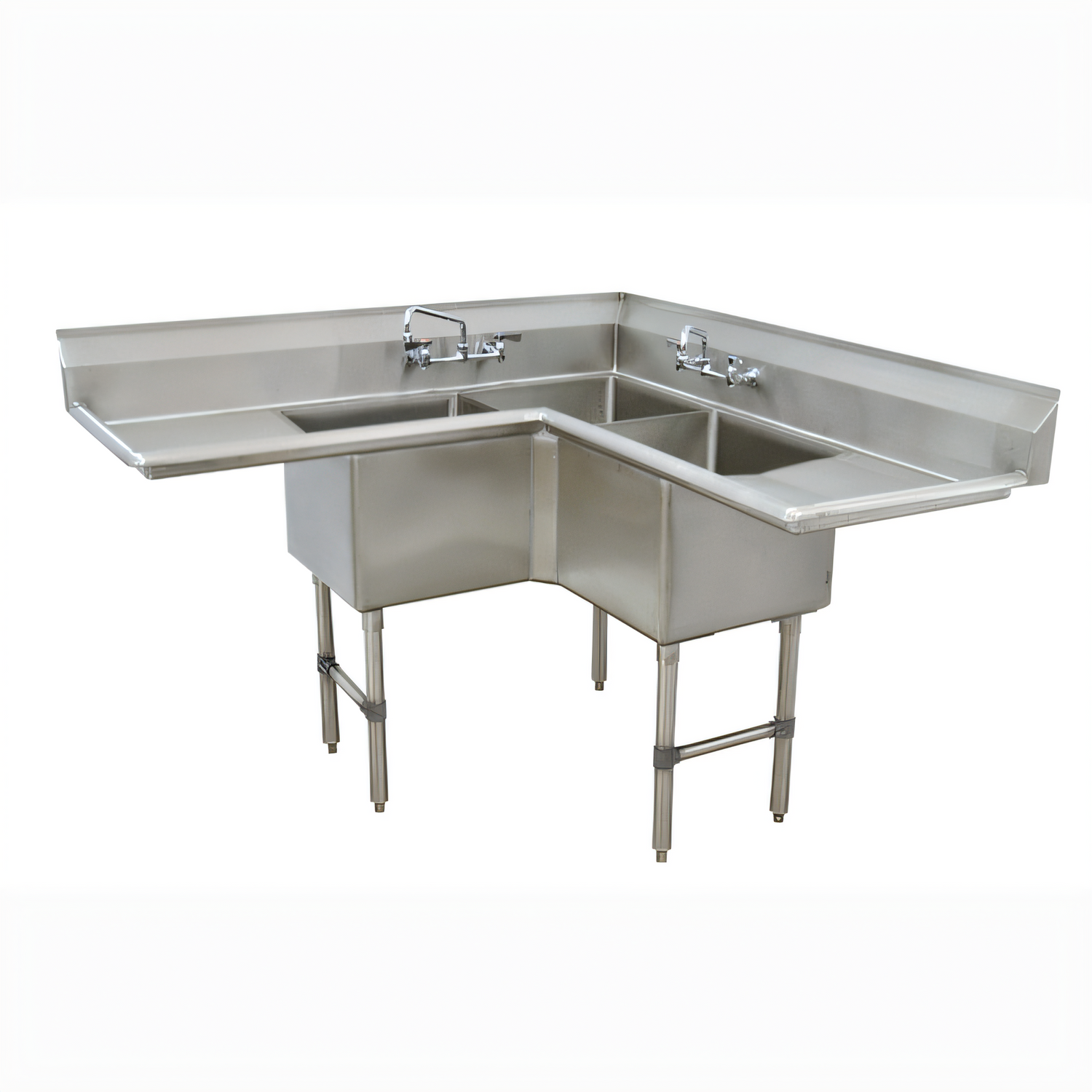 57" × 57" L-Shape • dual 18" drainboards • 16 ga 304 SS • NSFTurn an unused corner into a fully compliant ware-washing station. The FC-K6-18D combines three spacious 18" × 18" × 14" compartments with right- and left-hand 18" drainboards, giving you a complete wash / rinse / sanitize set-up that meets NSF requirements while saving valuable linear footage along your wall.