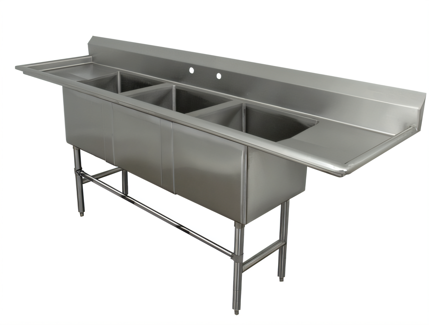 112" L x 34" D • 20" x 28" x 14" Bowls • Dual 24" DrainboardsTake on high-volume ware-washing with confidence. Built from heavy-duty 16-gauge 304 stainless steel and reinforced with adjustable cross-bracing, the Advance Tabco FC3M-2028-24RLX delivers uncompromising durability, abundant work space and NSF-listed sanitation at an economy-friendly price.