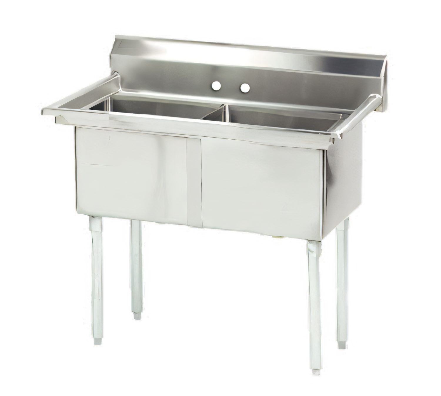 Special Value Fabricated Sink, 2-compartment, no drainboards, bowl size 16" x 20" x 12" deep, 18 gauge 304 stainless steel, tile edge splash, rolled edge, 8" OC faucet holes, galvanized legs with 1" adjustable plastic bullet feet, overall 25-3/4" F/B x 37" L/R, NSF
