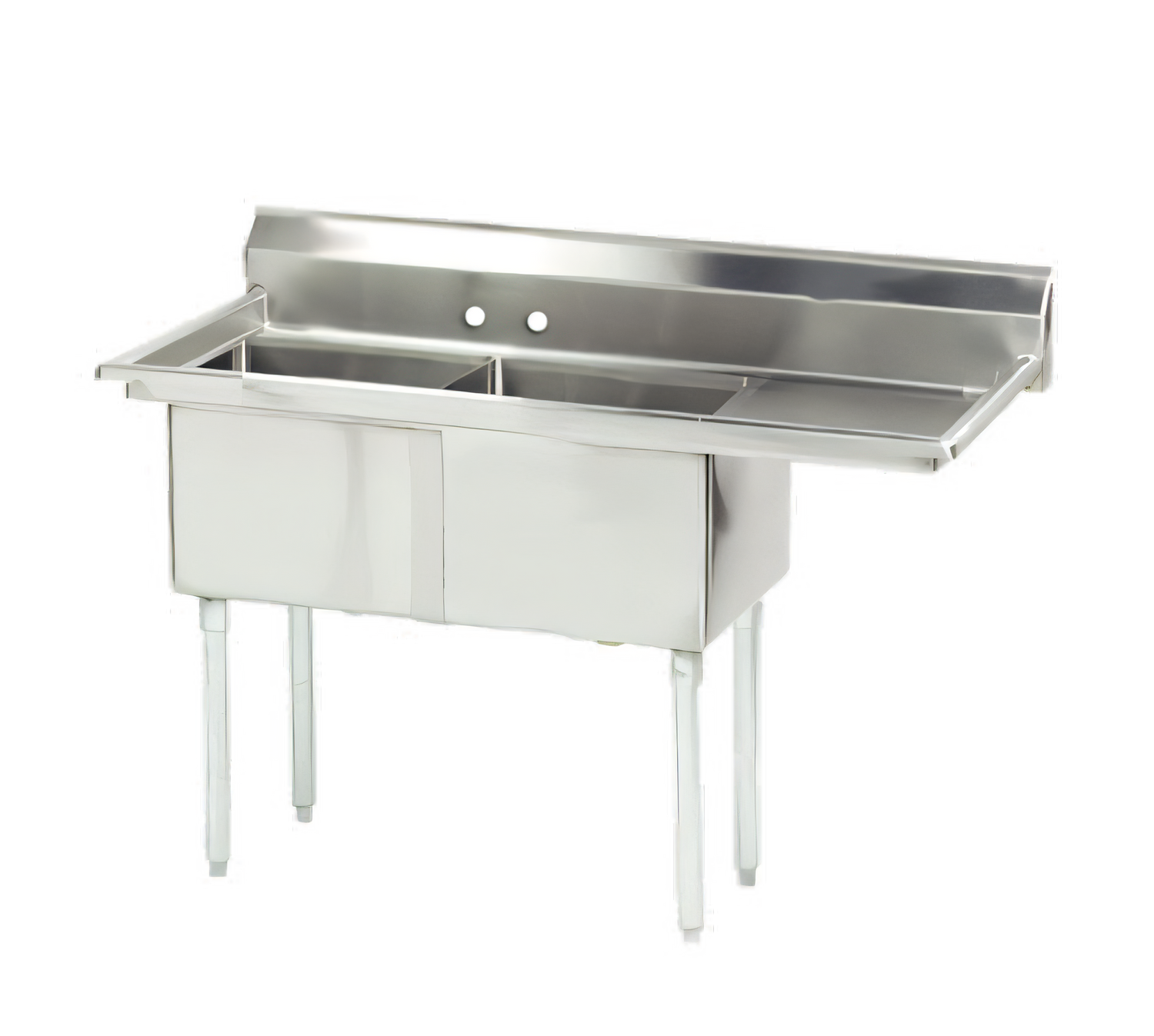 Special Value Fabricated Sink, 2-compartment, 18" right drainboard, bowl size 18" x 18" x 12" deep, 18 gauge 304 stainless steel, tile edge splash, rolled edge, 8" OC faucet holes, galvanized legs with 1" adjustable plastic bullet feet, overall 23-3/4" F/B x 56-1/2" L/R, NSF