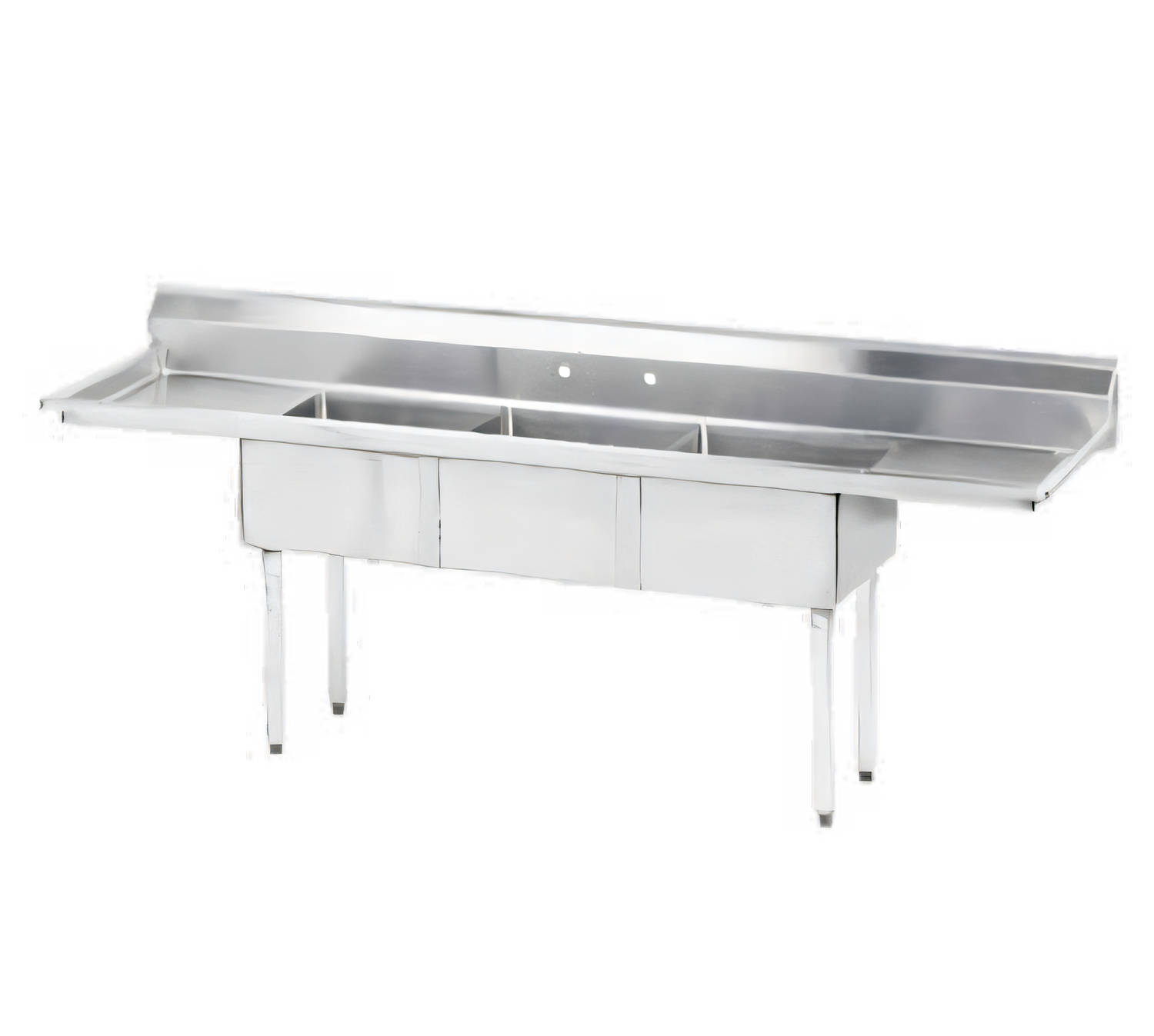 Special Value Fabricated Sink, 3-compartment, 12" right & left drainboards, bowl size 14" x 16" x 12" deep, 18 gauge 304 stainless steel, tile edge splash, rolled edge, 8" OC faucet holes, galvanized legs with 1" adjustable plastic bullet feet, overall 21-3/4" F/B x 66" L/R, NSF