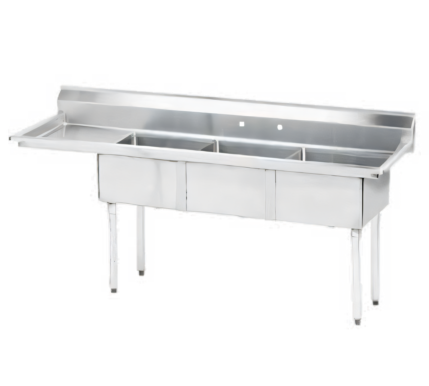 Special Value Fabricated Sink, 3-compartment, 15" left drainboard, bowl size 15" x 15" x 12" deep, 18 gauge 304 stainless steel, tile edge splash, rolled edge, 8" OC faucet holes, galvanized legs with 1" adjustable plastic bullet feet, overall 20-3/4" F/B x 62-1/2" L/R, NSF (Special Value NET Pricing)