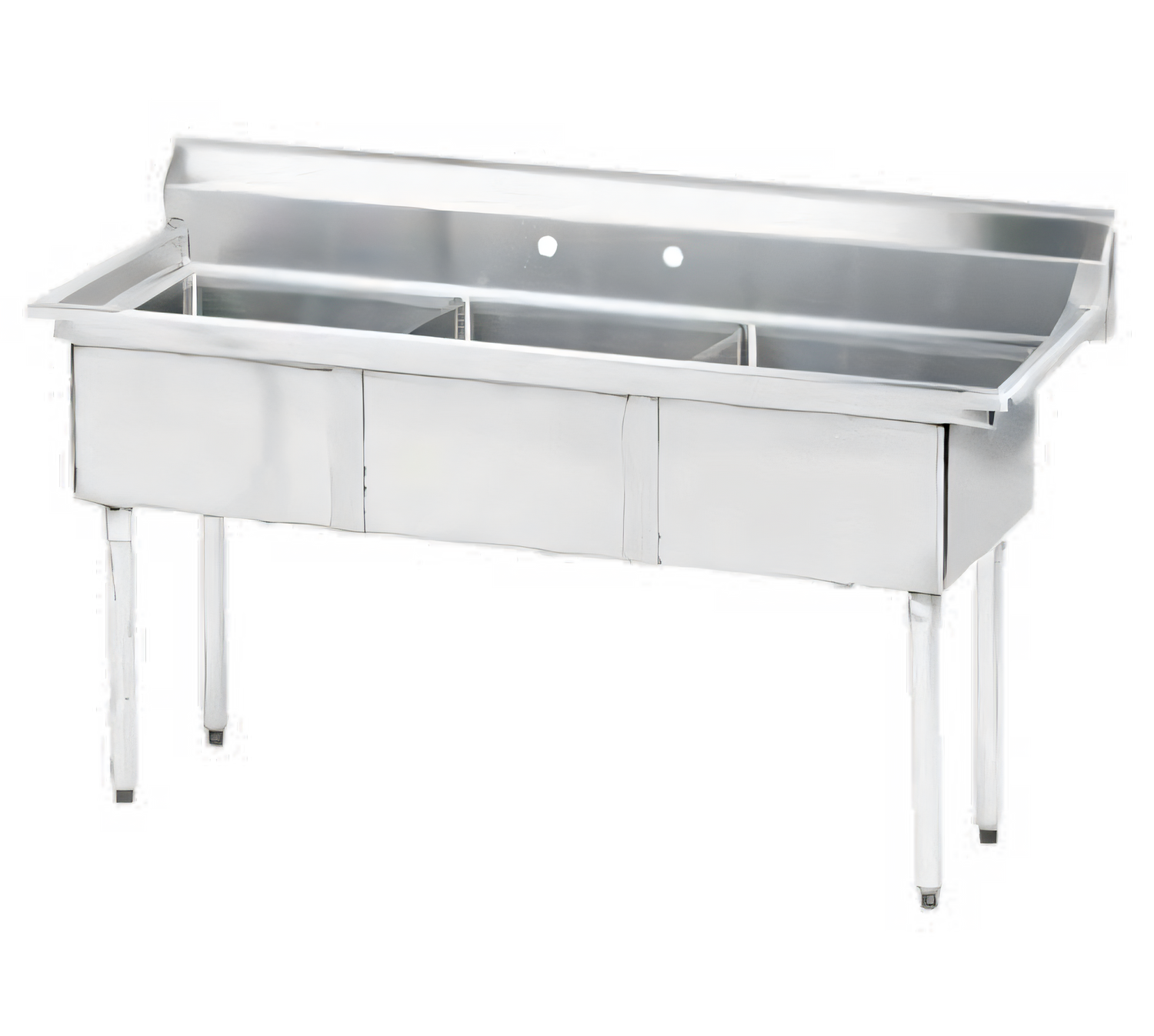 Special Value Fabricated Sink, 3-compartment, no drainboards, bowl size 16" x 20" x 12" deep, 18 gauge 304 stainless steel, tile edge splash, rolled edge, 8" OC faucet holes, galvanized legs with 1" adjustable plastic bullet feet, overall 25-3/4" F/B x 53" L/R, NSF (Special Value NET Pricing)