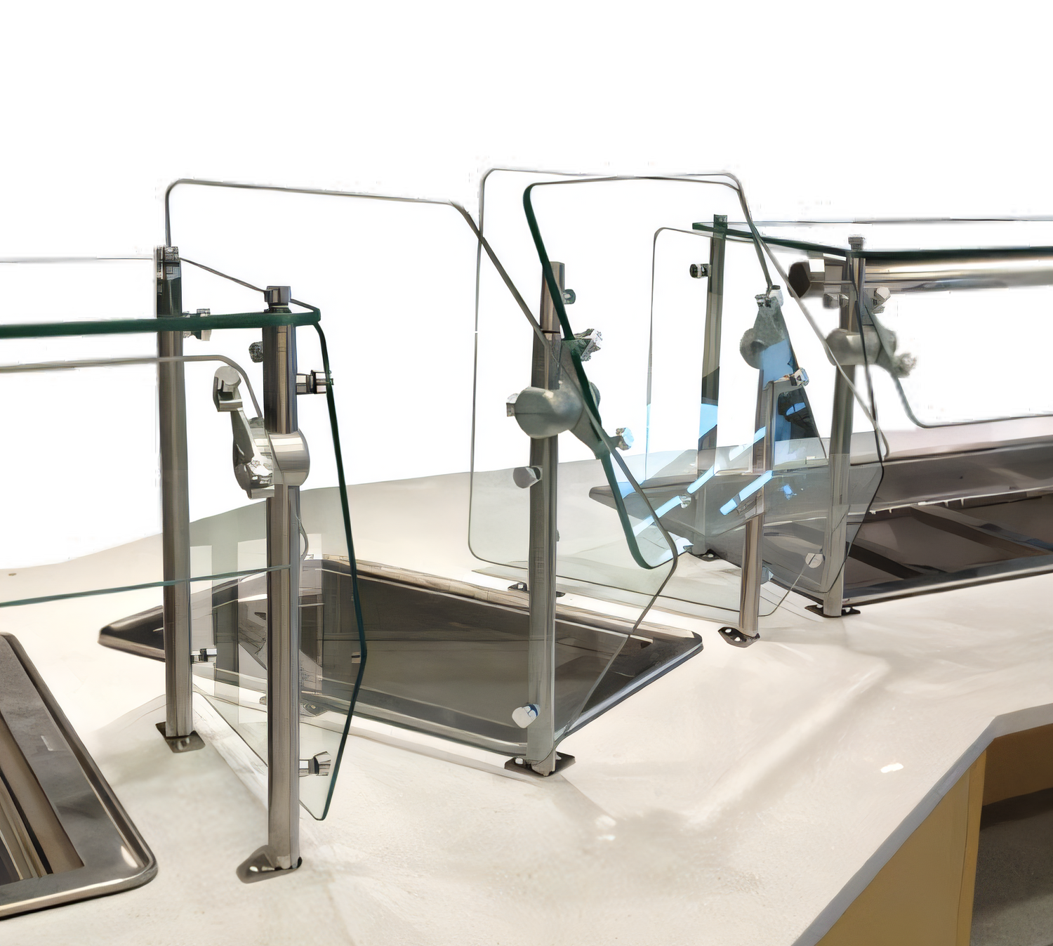 Advance Tabco GS-144 Sleek Shield™ self-service food shield: adjustable tempered glass, Chamber Lock™ rotation, NSF-compliant side panels.