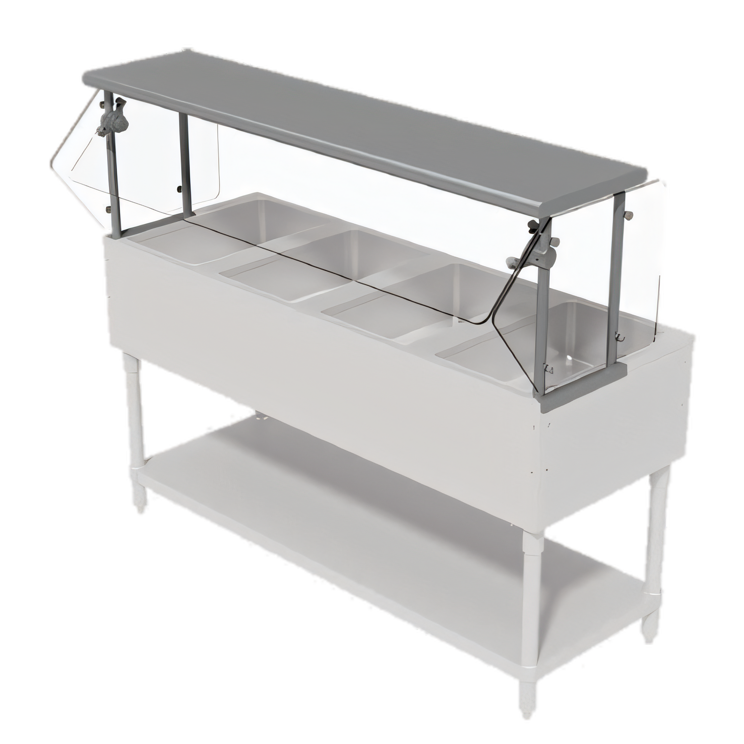 Sleek Shield™ Food Shield, self service with adjustable front glass, 62-7/16"W x 19-3/4"D x 18"H (with 15" wide glass top shelf), 3/8" thick heat tempered glass front & 1/4" side panels (side panels 19-3/4" deep to meet NSF requirements), 3/8" thick heat tempered top glass, equipped with Chamber Lock™ technology fixed to upright legs, allowing rotation in 15 degree intervals, maximum load on top glass 100 pounds evenly distributed weight (for Advance Tabco (4) well hot or cold food tables) (NOTE: due to mounting requirements, this food shield extends 15/16” beyond the end of the hot or cold food table on each end. Units set side by side must allow for this additional space)
