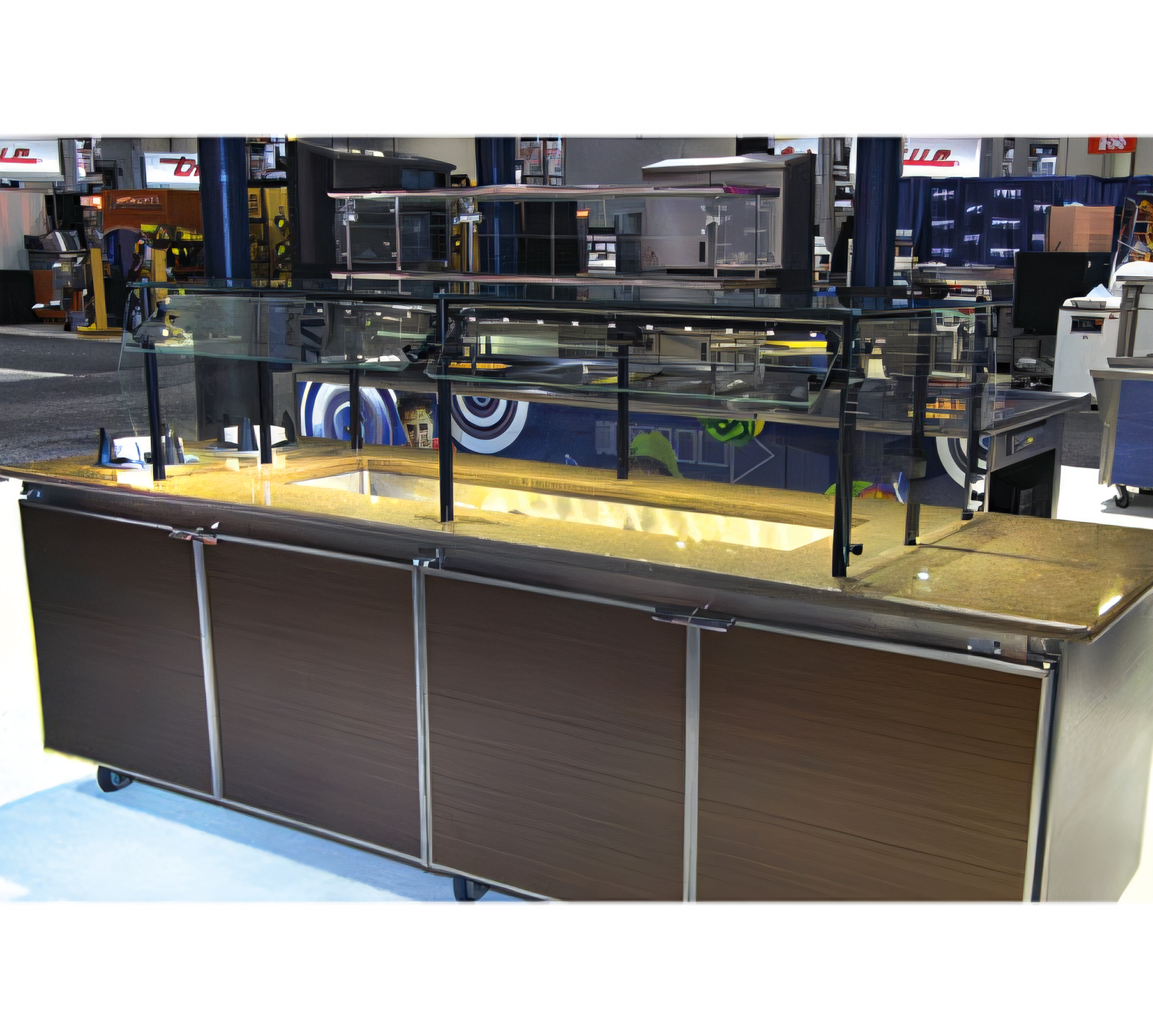 Advance Tabco Sleek Shield self-service food shield, adjustable double-sided tempered glass, 40"D x 132"W, durable Chamber Lock rotation.