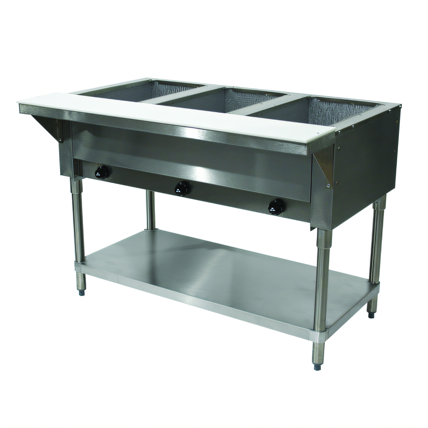 - (3) full-size 12" × 20" hot wells accept standard or fractional steam-table pans