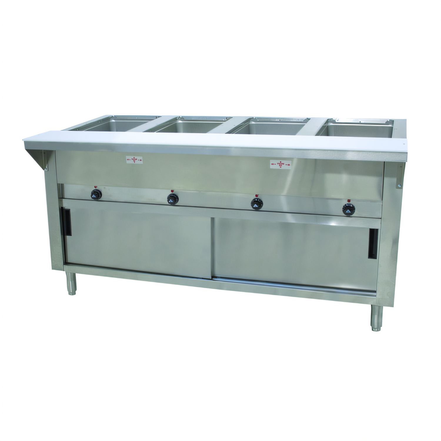 Model HF-4E-DR • 62-7/16 W × 30-5/8 D × 34-1/8 HDesigned for demanding commercial kitchens, the Triumph (Supreme) keeps pre-heated menu items at safe serving temperatures while adding a durable stainless-steel work surface and storage space to your line. Four 12" × 20" open wells, individual infinite controls, and an 8" deep cutting-board shelf make plating fast, safe, and efficient.