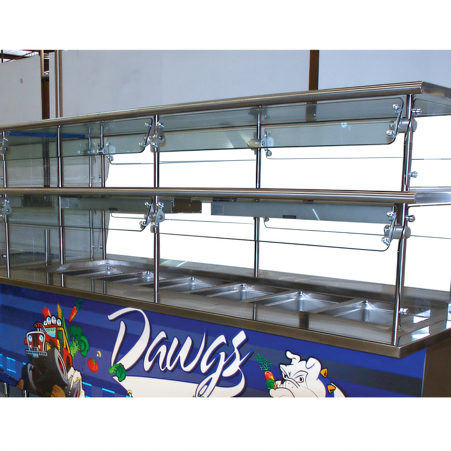 Advance Tabco Sleek Shield 96" stainless food shield: adjustable tempered glass, double tier, NSF-compliant, Chamber Lock rotation.