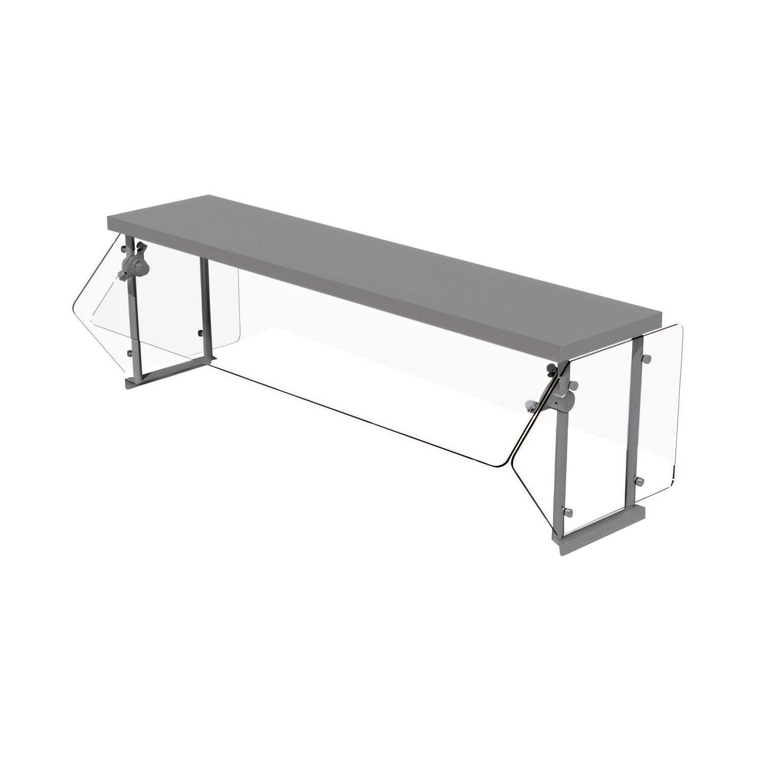 Sleek Shield™ Food Shield, self service with adjustable front glass, 62-7/16"W x 19-3/4"D x 18-3/4"H (with 15" wide stainless steel top shelf), 3/8" thick heat tempered glass front & 1/4" side panels (side panels 19-3/4" deep to meet NSF requirements), equipped with Chamber Lock™ technology fixed to upright legs, allowing rotation in 15 degree intervals for Advance Tabco (4) well hot or cold food tables) (NOTE: due to mounting requirements, this food shield extends 15/16” beyond the end of the hot or cold food table on each end. Units set side by side must allow for this additional space)