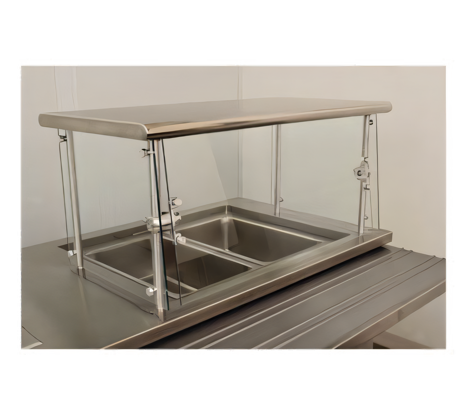 Sleek Shield™ Food Shield, cafeteria style with adjustable front glass, 132"W x 18"D x 19-1/4"H, with stainless steel top shelf, 3/8" thick heat tempered glass front & 1/4" thick side panels (side panels 18" deep to meet NSF requirements), equipped with Chamber Lock™ technology fixed to upright legs, allowing rotation in 15 degree intervals, includes: additional center support leg, NSF