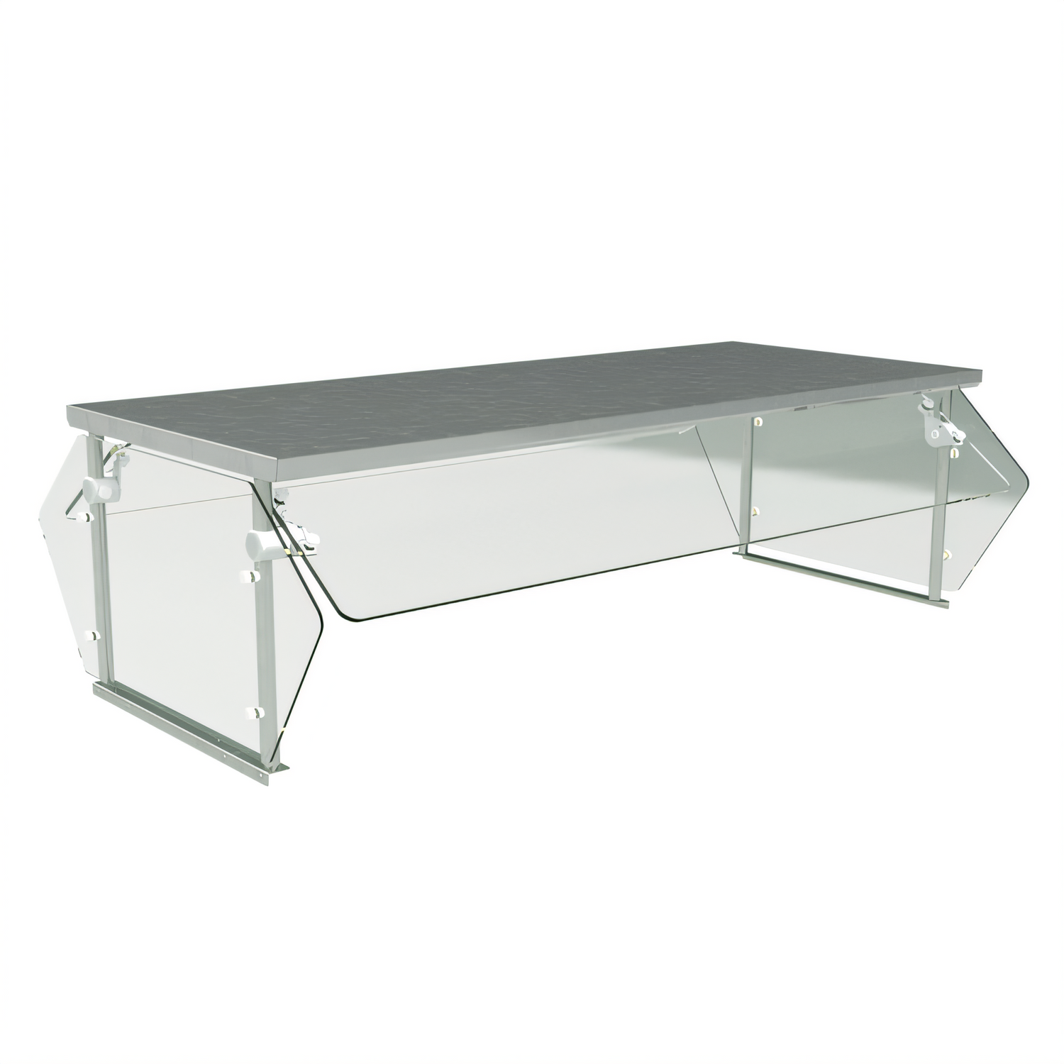 Sleek Shield™ Food Shield, self service with adjustable front glass, double sided, 144"W x 40"D, 19-1/4" tall with stainless steel top shelf, 1/4" thick heat tempered glass front & side panels, equipped with Chamber Lock™ technology fixed to upright legs, allowing rotation in 15 degree intervals