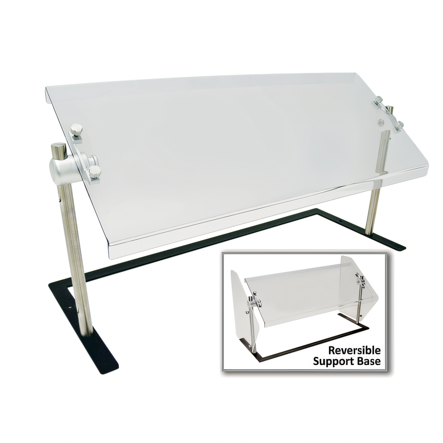 Sleek Shield™ Food Shield, self service, portable, 25-3/4"W x 18"D x 22"H, (24" nominal size) without top shelf, 1/4" thermoplastic front panel (optional side panels order PFS-SP), equipped with Chamber Lock™ technology fixed to upright stainless steel legs, allowing rotation in 15 degree intervals. Base is powder coated steel with a black finish