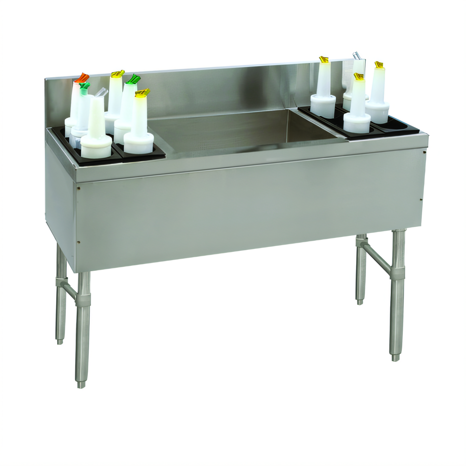 - 7" backsplash with 1 3⁄4" return & soda-gun knock-out keeps walls dry and organized.