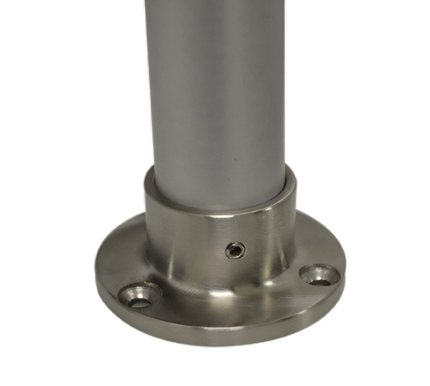 Brushed stainless steel mounting bracket for 1" post food shields/overshelves; field-installable, one per table leg.
