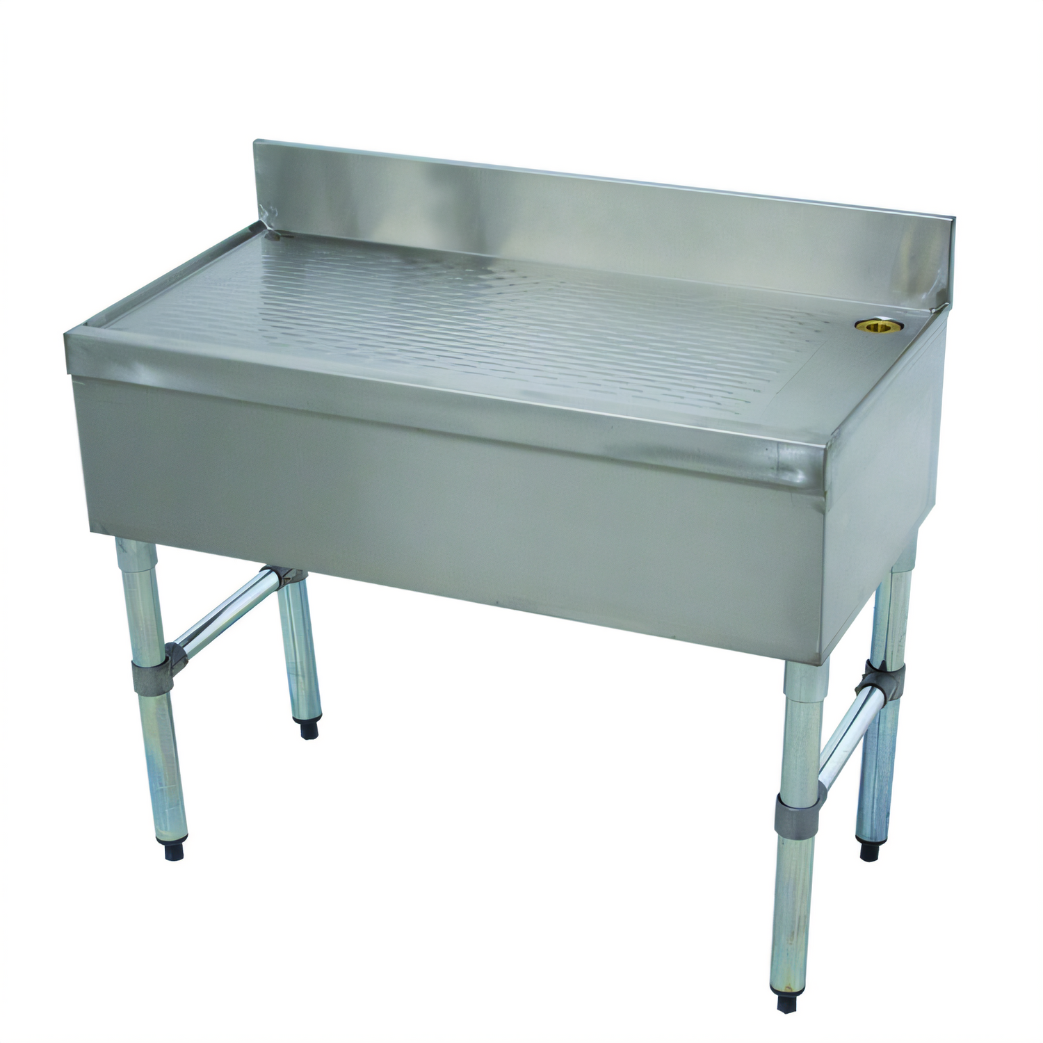 Special Value Bar Type Drainboard, free-standing, 12"W x 18"D x 33"H, 4"H backsplash, embossed drainboard with 1" IPS drain, stainless steel construction, galvanized legs with adjustable cross-bracing & adjustable plastic bullet feet, NSF (Special Value NET Pricing)