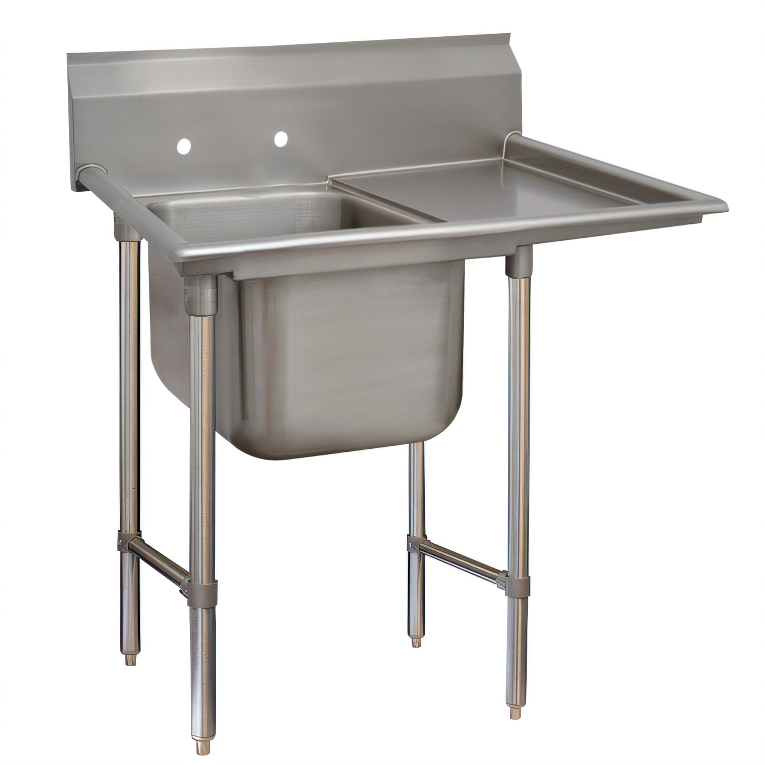 Advance Tabco T9-1-24-18R – NSF Listed, 18 ga 304 Stainless SteelBuilt for busy dish rooms, prep areas, and bar stations, this Advance Tabco Special Value Regaline sink gives you premium T9-Series construction in a compact, one-compartment footprint. A seamless deep-drawn bowl, 18″ pitched drainboard, and rugged galvanized frame deliver the durability you need at a price that keeps your budget on track.