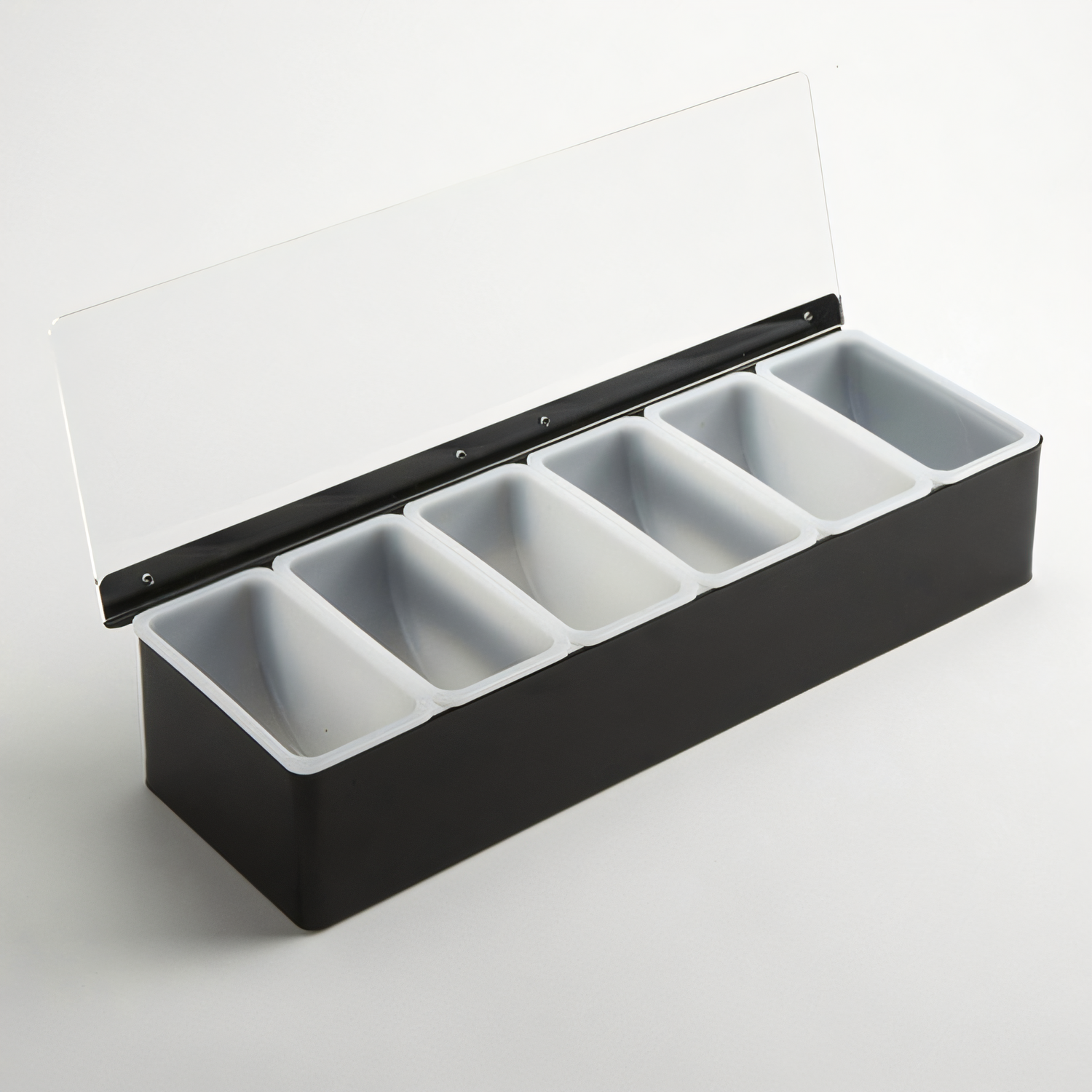Condiment Holder, 6-compartment, 17-3/4"L x 5-3/4"W x 3-1/2"H, countertop, (6) 16 oz. plastic containers, stainless steel housing, black