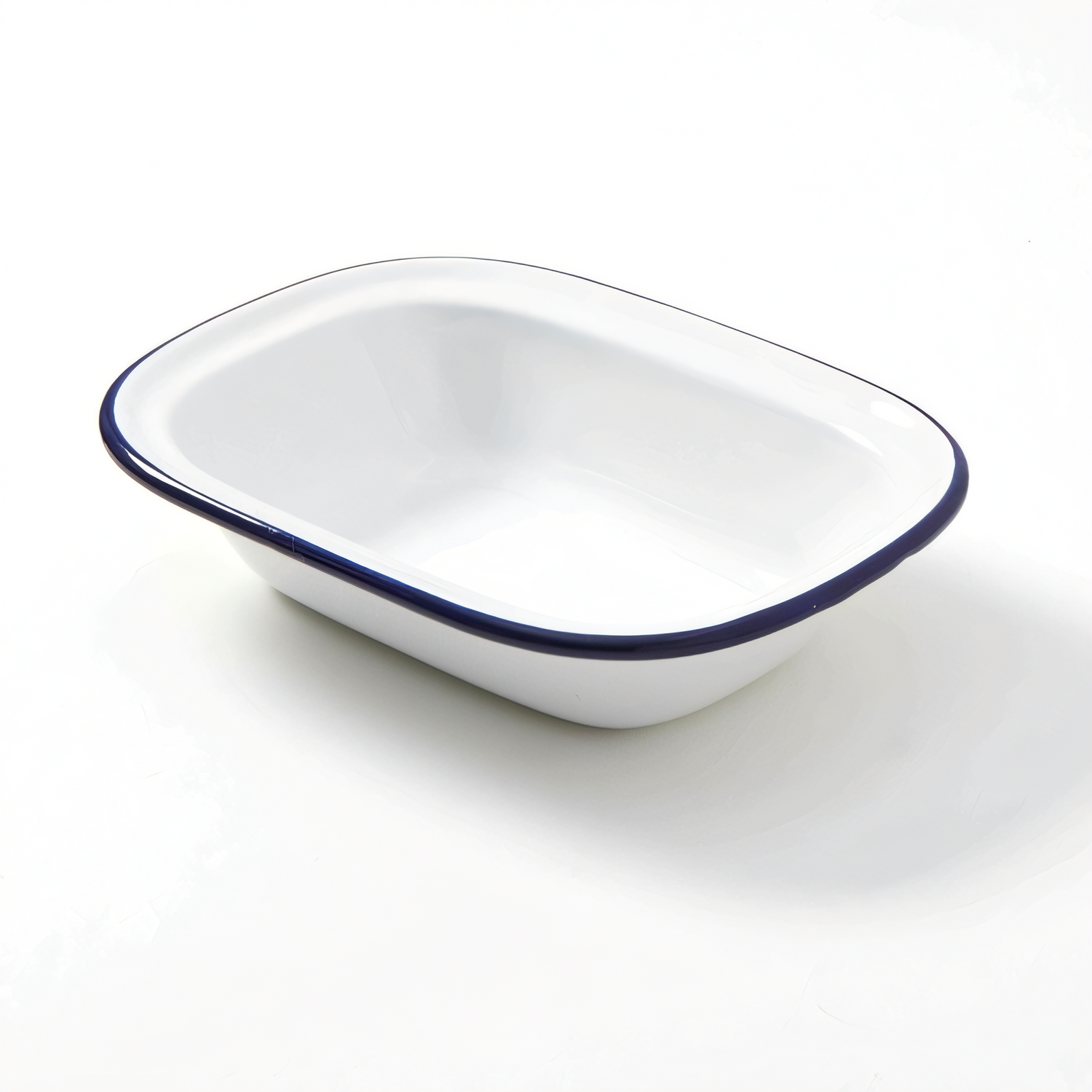 Enamelware Bowl, 16 oz., 7-7/8"L x 5-7/8"W x 1-1/2"H, oblong, enamel coated steel, white with blue rim (hand wash only)