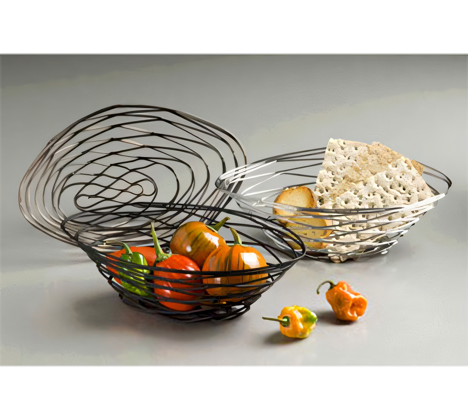 American Metalcraft 9"x6" oval Birdnest wire serving basket, black finish. Durable, stylish display; hand wash only.