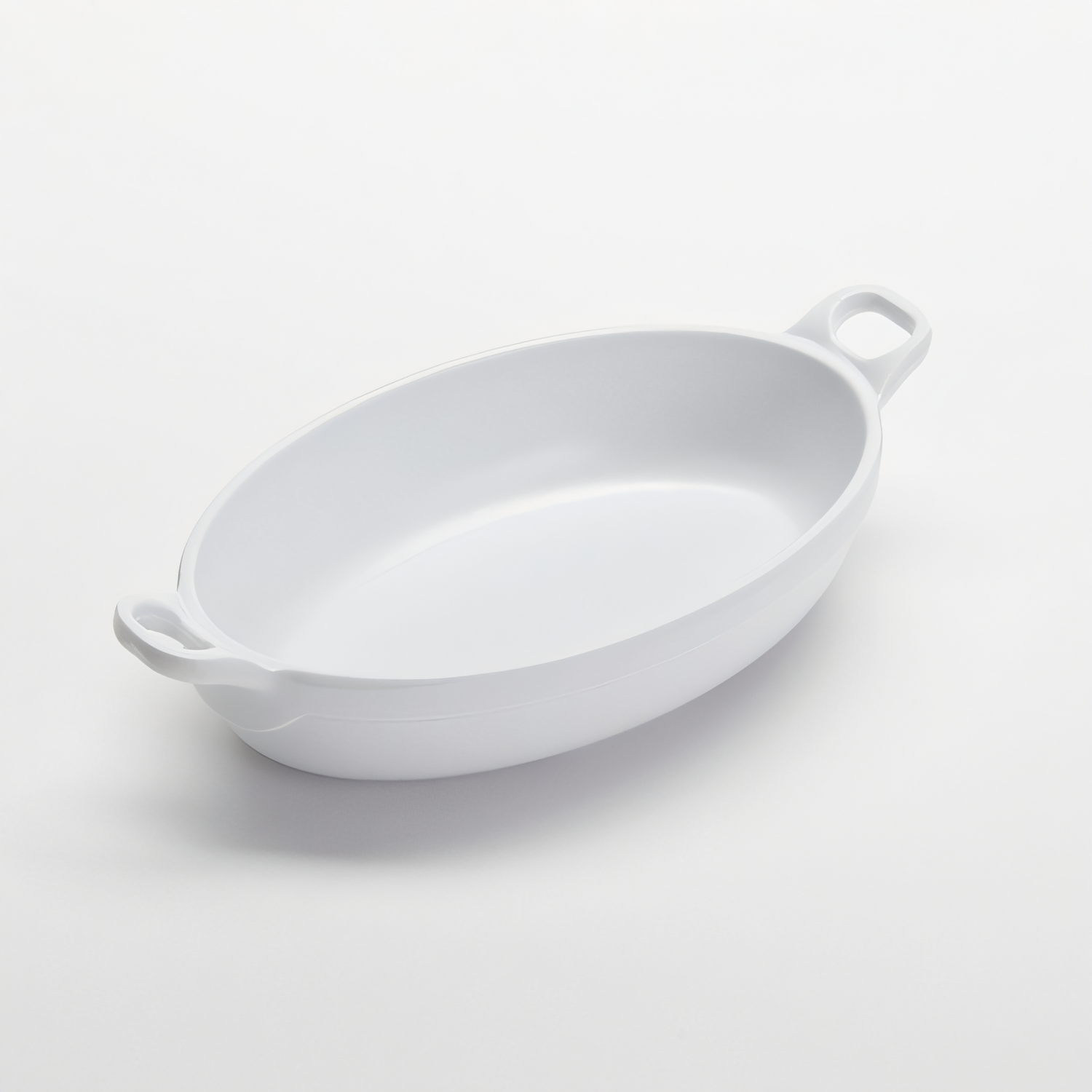 Casserole, 5 oz., 4-3/4" L X 3" W X 1-1/4" H, 6" L (with handle), Oval, Melamine, White