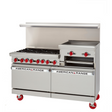 Restaurant Range, gas, 72", (6) 32,000 BTU open burners, (1) 36" raised griddle/broiler on right, 3/4" thick plate, manual controls, (1) 26-1/2" convection oven on left, (2) racks, (1) 26-1/2" storage base on right, stainless steel front, sides, choice of high shelf and riser, 20" riser or 6" stub back, 6" adjustable chrome plated legs, 83.0kW, 282,000 BTU, cETLus, ETL-Sanitation, Made in USA