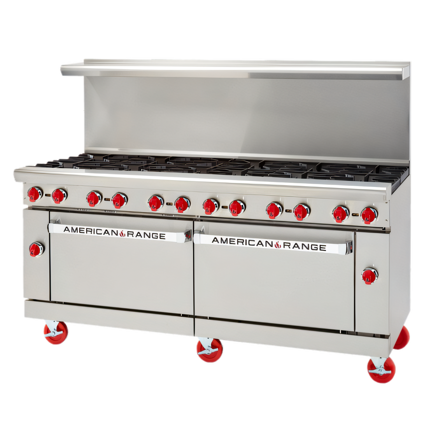 American Range • Made in USA • cETLus & ETL-Sanitation ListedBuilt for the busiest kitchens, this American Range 72 inch restaurant range pairs a massive 1 inch-thick steel griddle with two high-performance convection ovens—delivering the power, consistency, and durability chefs demand shift after shift.