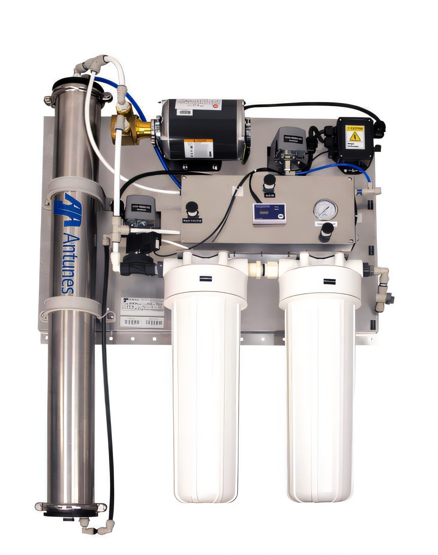 Antunes AQ-RO-HC RO system: compact wall‑mount, up to 2500 GPD, 98% TDS reduction, includes feed pump, valves & gauges.