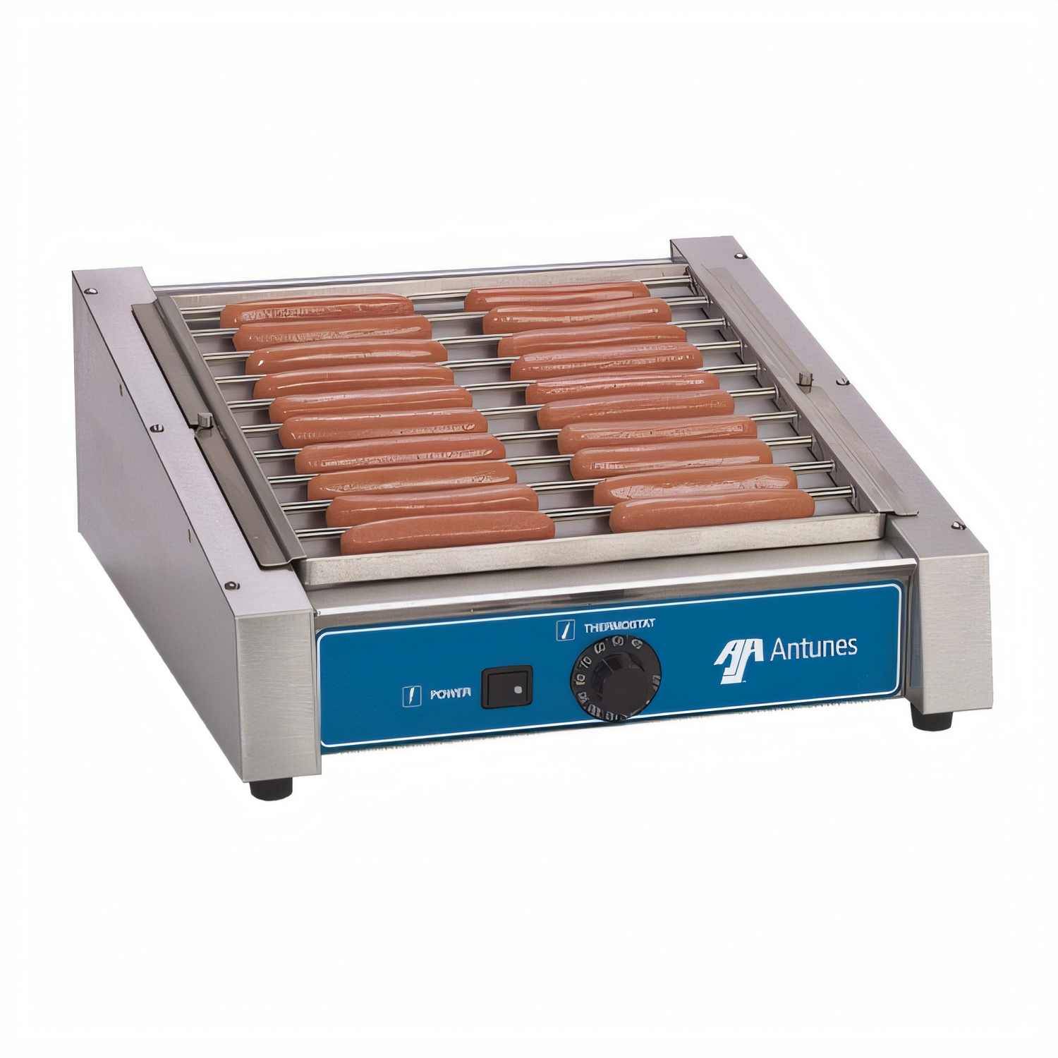 Antunes HDC-20 hot dog grill: stainless steel, thermostatic control, holds 20 dogs, 120V 1000W, cETLus certified—reliable high-capacity grilling.