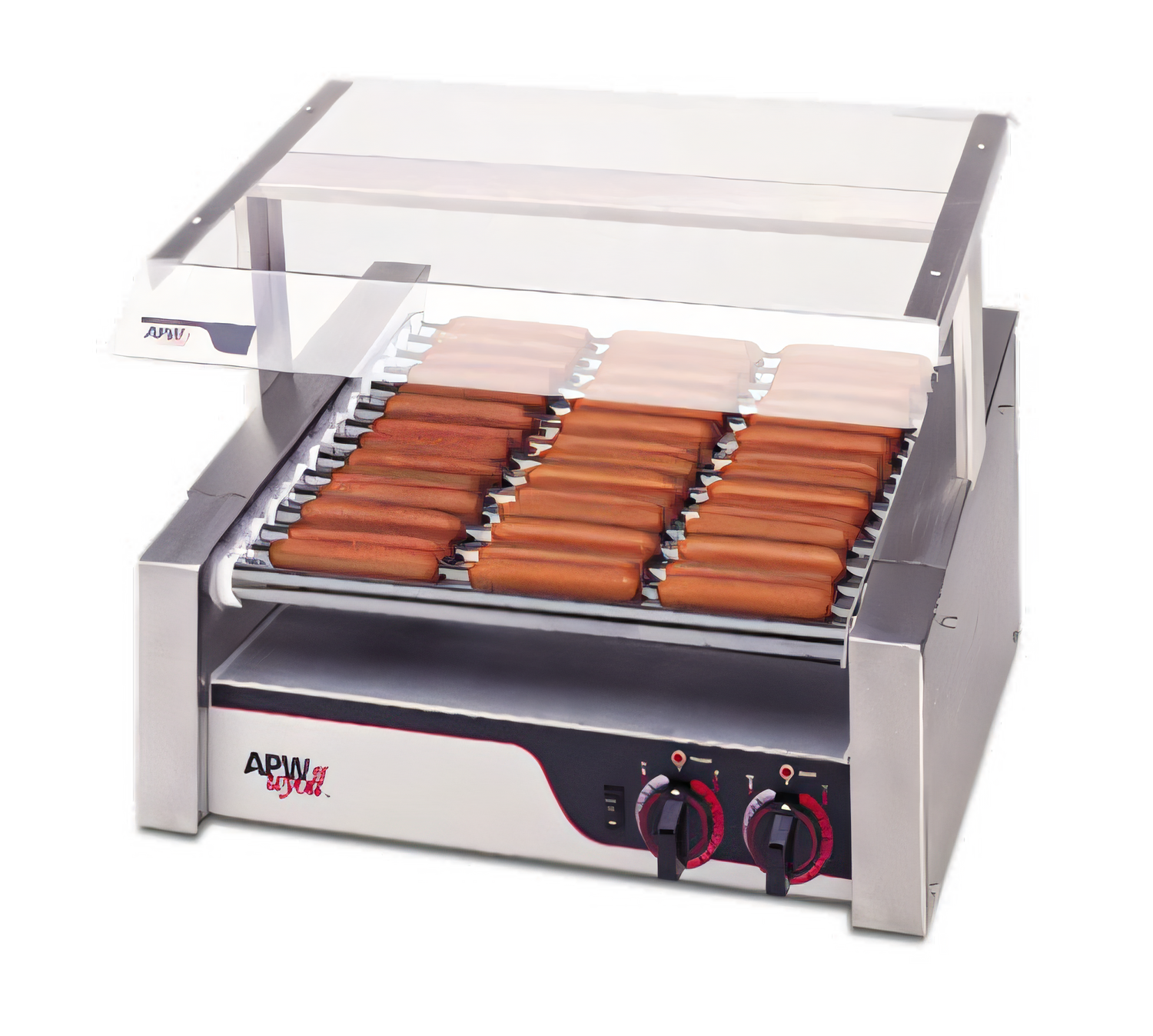 APW Wyott X*PERT HR-31 HotRod hot dog grill: 11 chrome rollers, infinite controls, removable grease pan, stainless exterior — durable, easy to clean.