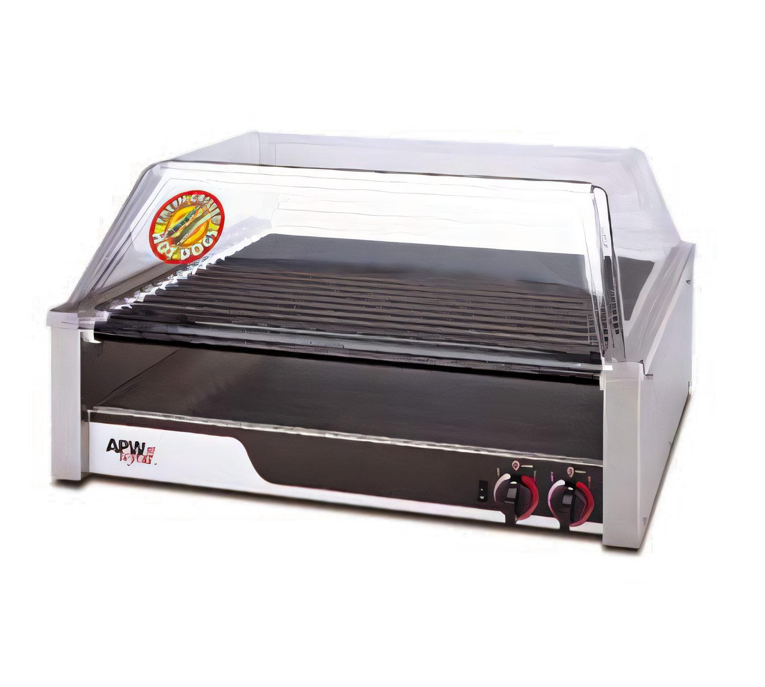 APW Wyott X*PERT HRS-45 HotDog Grill: Tru-Turn rollers, infinite controls, removable grease pan, stainless exterior, NSF/UL certified.