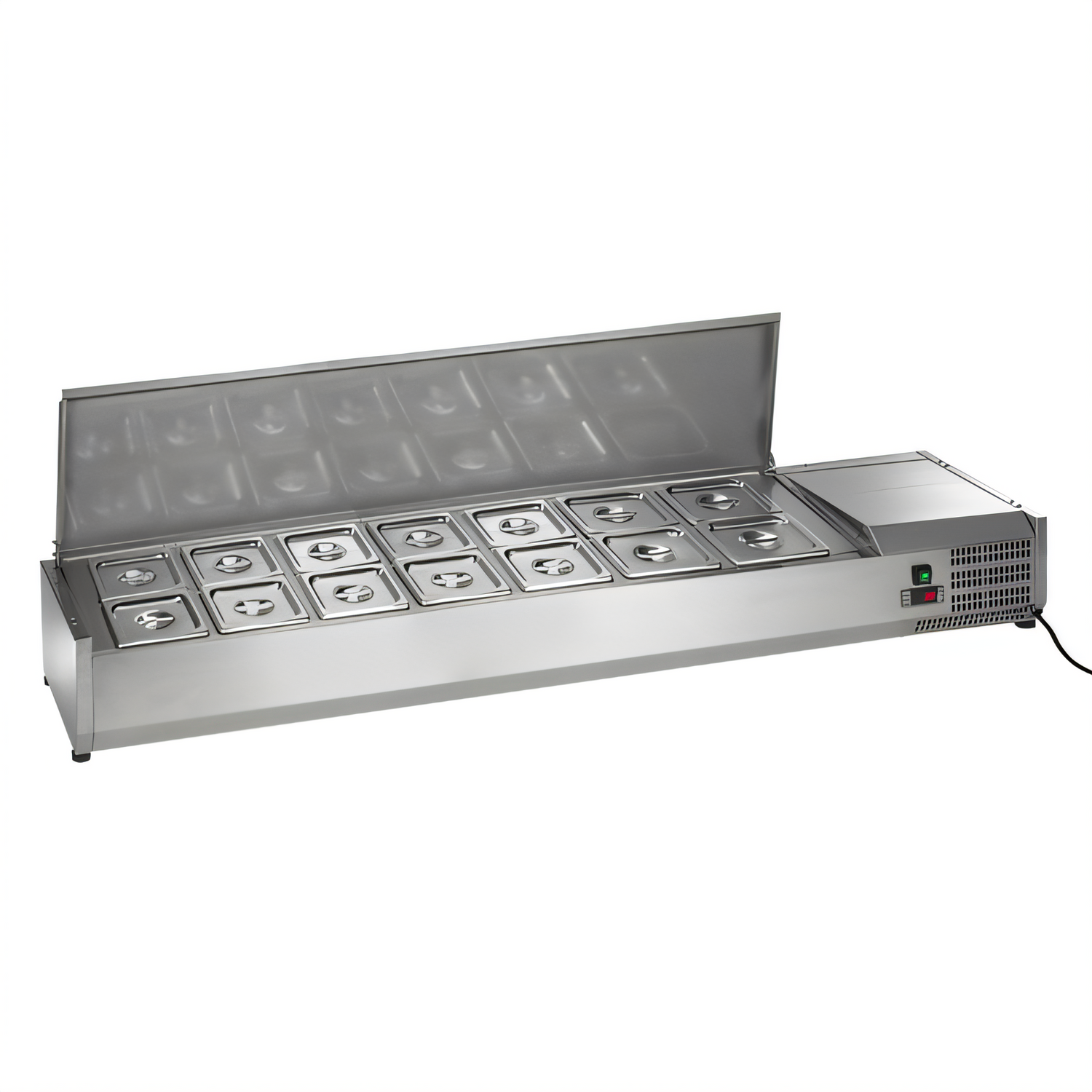 - Includes fourteen 1/6-size, 6"-deep stainless pans with matching covers, adapter bars and pan supports —ready to load straight out of the crate.