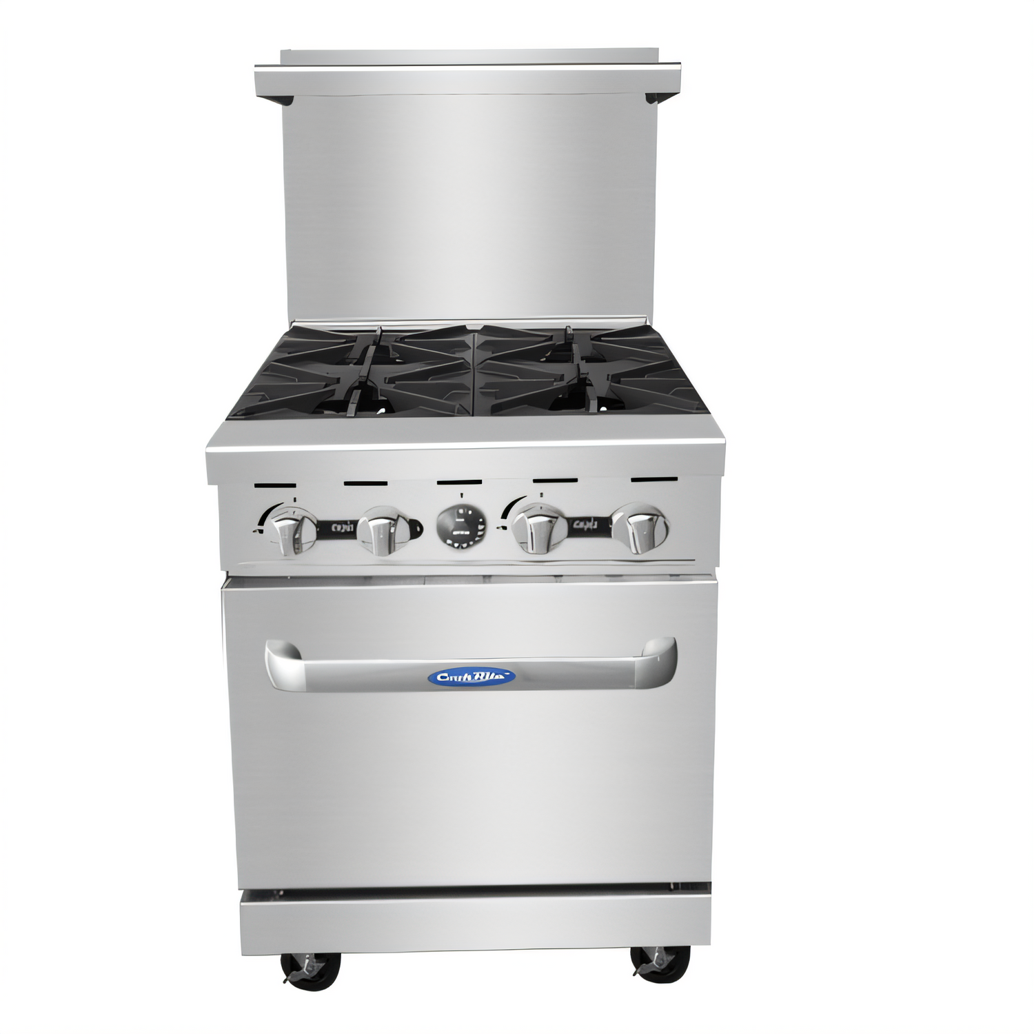 Model AGR-4B | Atosa USA, Inc.Built for kitchens where floor space is at a premium but performance is non-negotiable, the CookRite AGR-4B combines four powerful open burners with a full-size oven, rugged all-stainless construction and easy-rolling casters. From high-heat searing to low-and-slow roasting, this compact 24" range keeps up with the rush service after service.