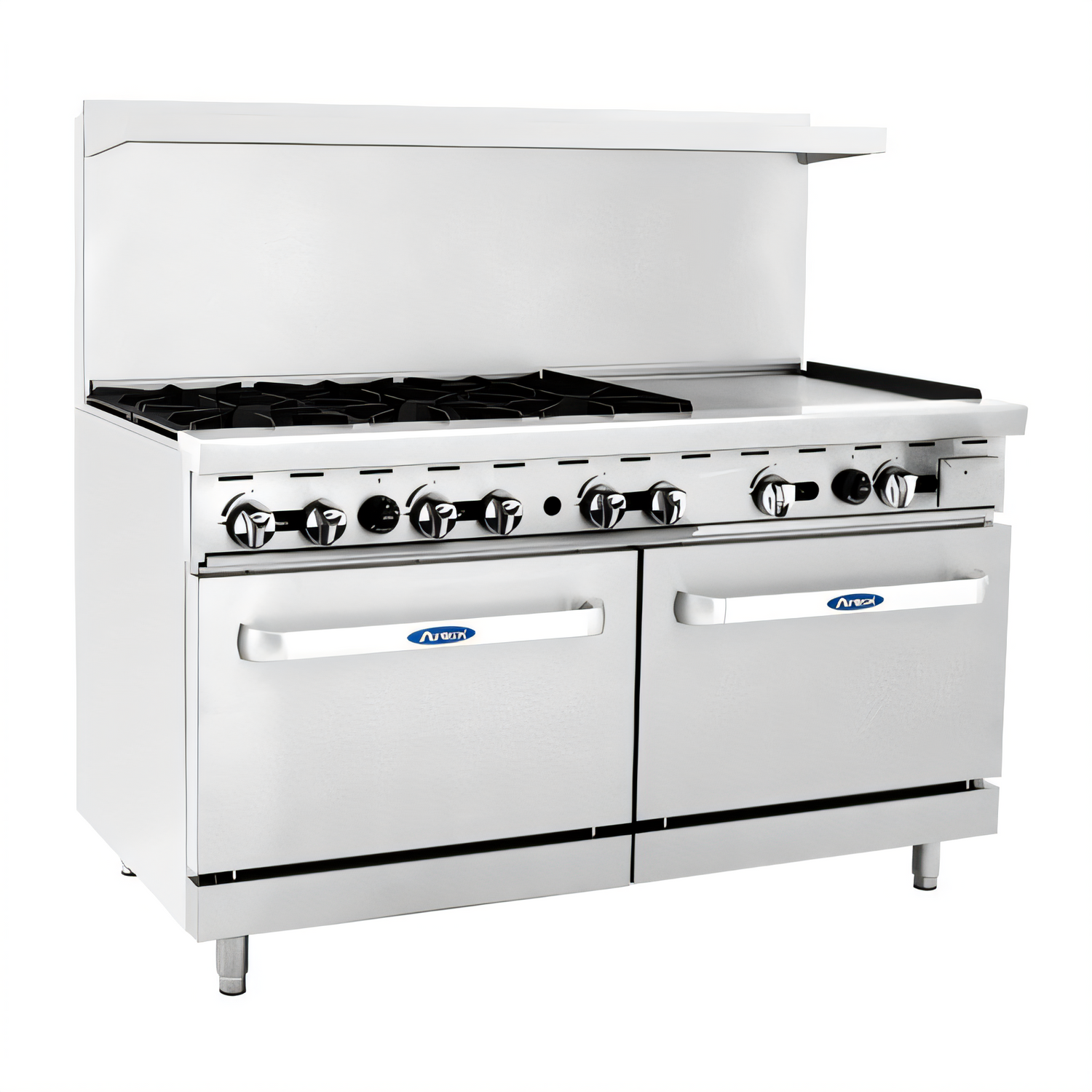 Model AGR-6B24G | 240,000 BTU | Atosa USABuilt for busy diners, ghost kitchens and institutional cafeterias, the CookRite AGR-6B24G combines six high-performance open burners, a full 24-inch griddle and two spacious ovens into a single 60-inch footprint—delivering unmatched flexibility while saving precious line space.