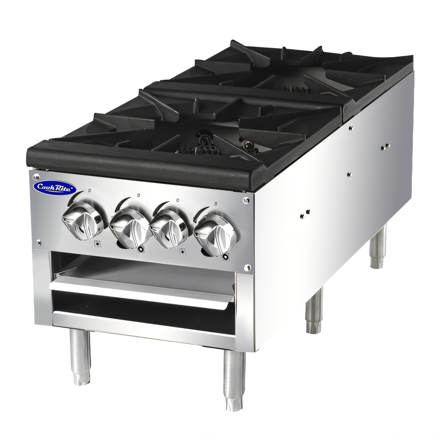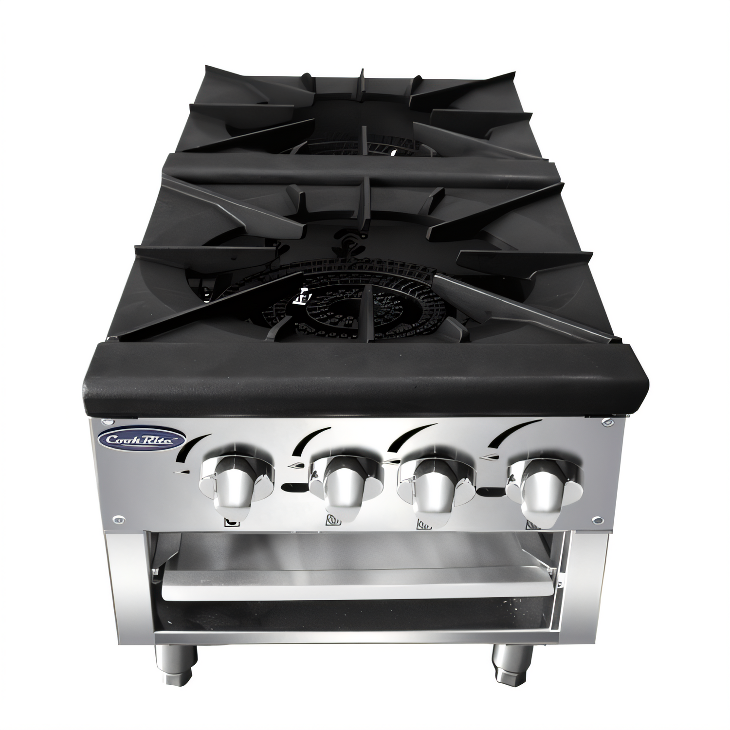Model ATSP-18-2L | 160,000 BTU Total OutputDesigned for demanding commercial kitchens, the CookRite ATSP-18-2L delivers big-pot performance from a low-profile frame. Two heavy-duty, three-ring cast iron burners give you the firepower to rapidly boil, braise, or simmer your largest stock pots while the all-stainless body stands up to years of high-heat abuse.