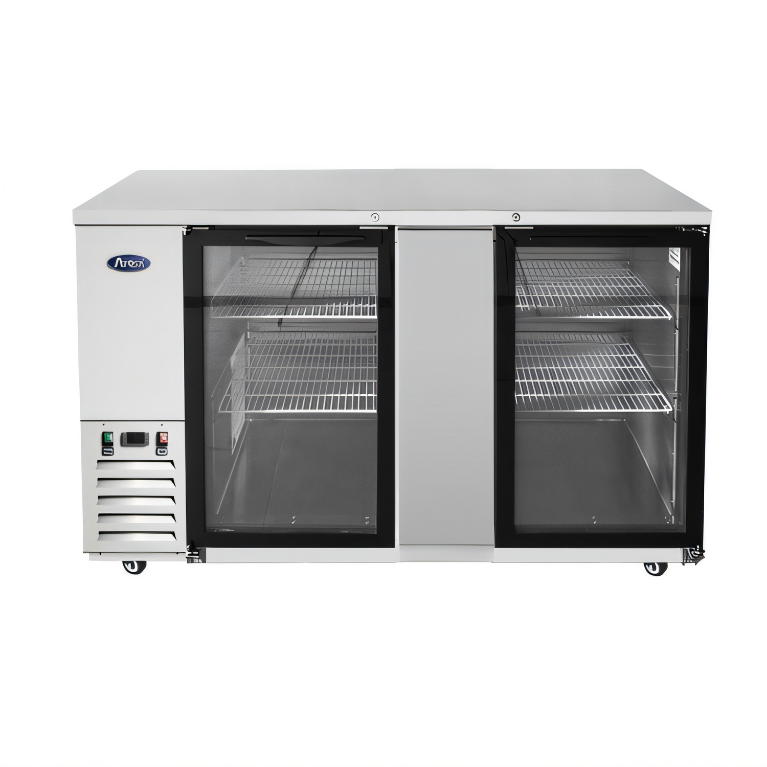 21.5 cu. ft. | Self-Contained Side-Mount | Stainless Steel Interior & ExteriorKeep bottled beers, canned seltzers, and cocktail mixers icy-cold and ready to serve with the Atosa MBB69GGR. Built for high-volume bars that demand reliability and presentation, this two-section back bar cooler combines a space-saving 68-inch footprint with crystal-clear locking glass doors, bright LED lighting, and precise digital temperature control.