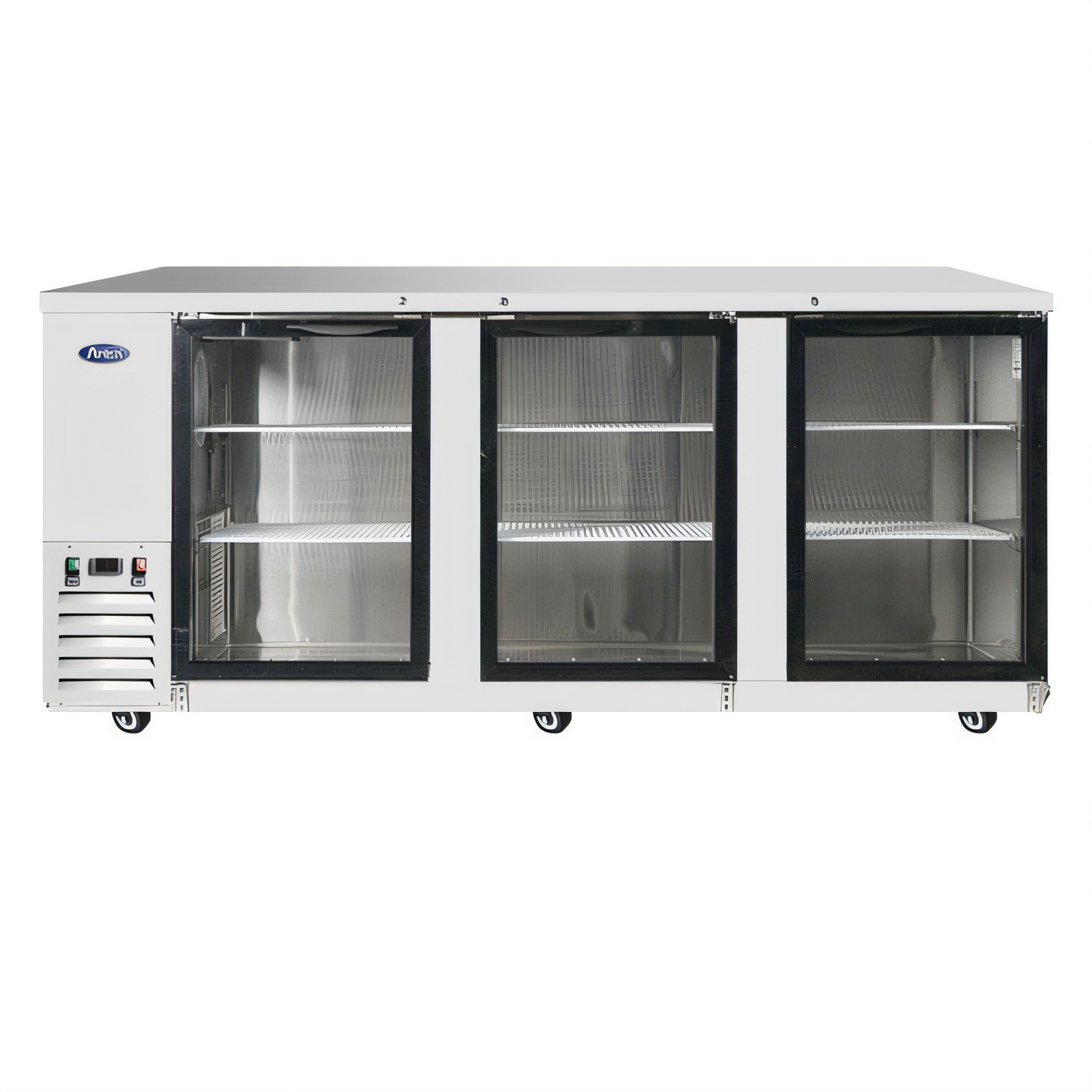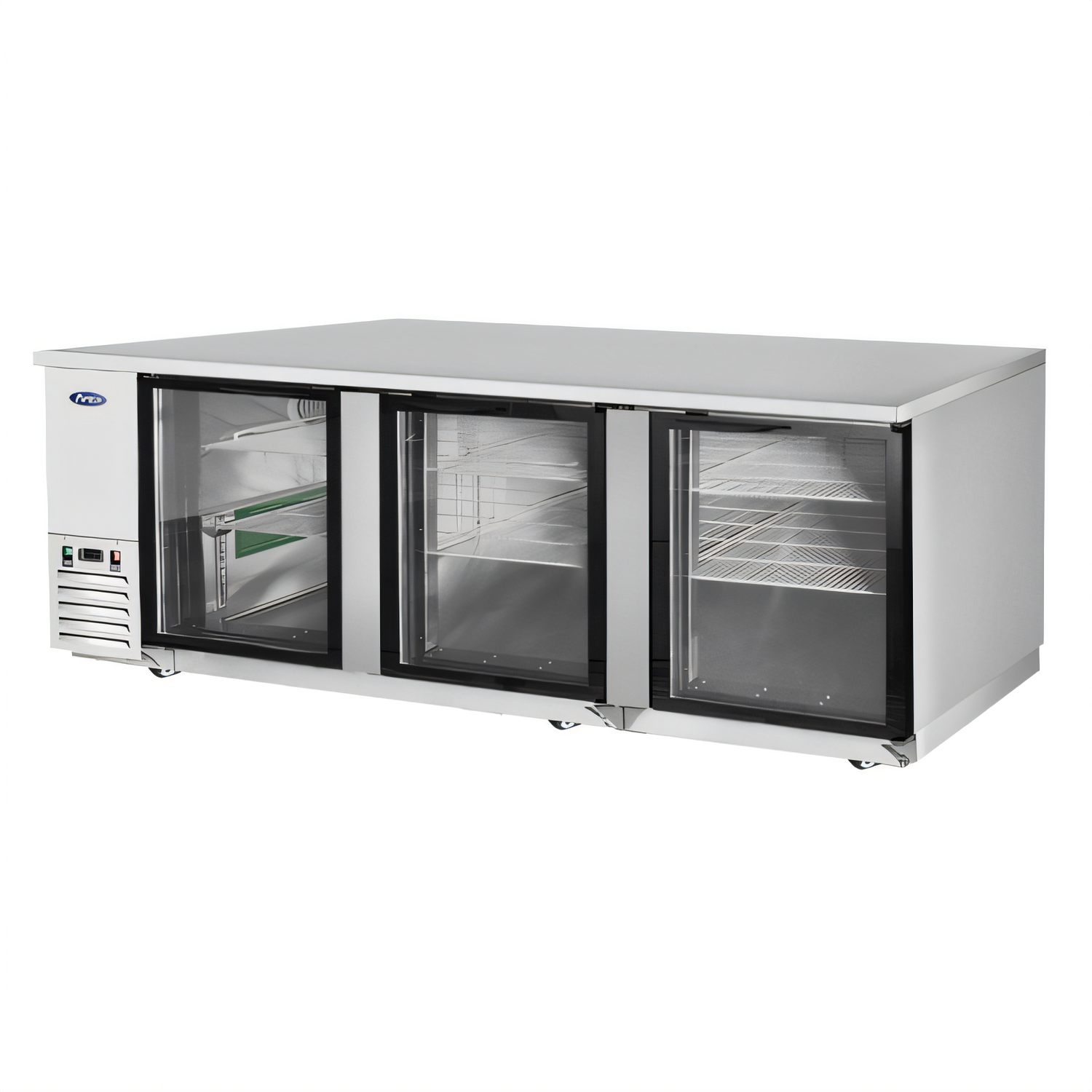89-3/10" W × 28-1/10" D × 40-1/8" H | Stainless Steel | 115 VKeep your best-selling bottles and cans icy-cold and brilliantly displayed behind the bar. The Atosa MBB90GGR combines a roomy 30.1 cu. ft. interior with energy-saving glass doors, slide-out refrigeration, and eco-friendly R290 refrigerant—everything you need for fast service and worry-free operation.