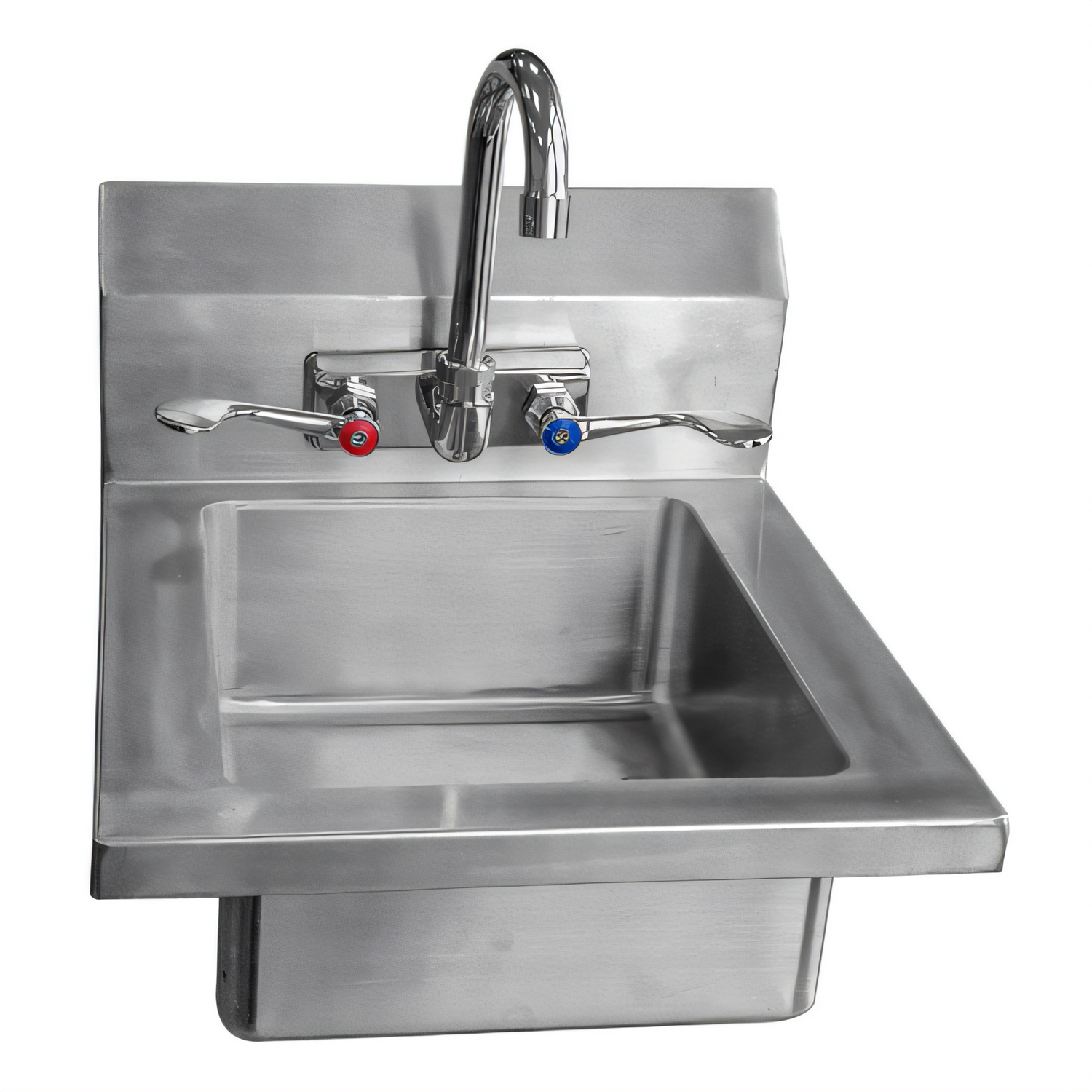 MixRite Hand Sink, 14"W, wall mount, 10"W x 12" front-to-back x 5"deep bowl, 18/300 series stainless steel, 6"H backsplash with 2" return, 1-1/2" dia. drain, includes: gooseneck faucet with wrist blade handles, strainer, Z-clip mounting bracket, NSF